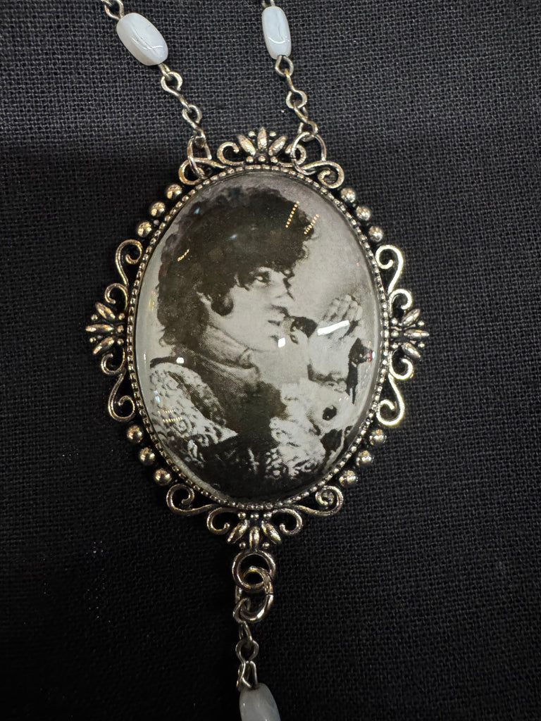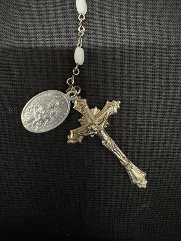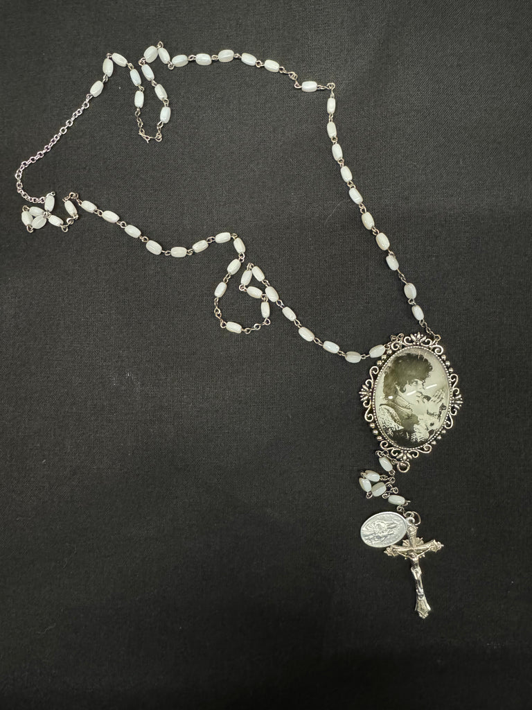 This vintage-inspired rosary features a Prince pendant surrounded by white pearlescent oval beads, and silver accents.