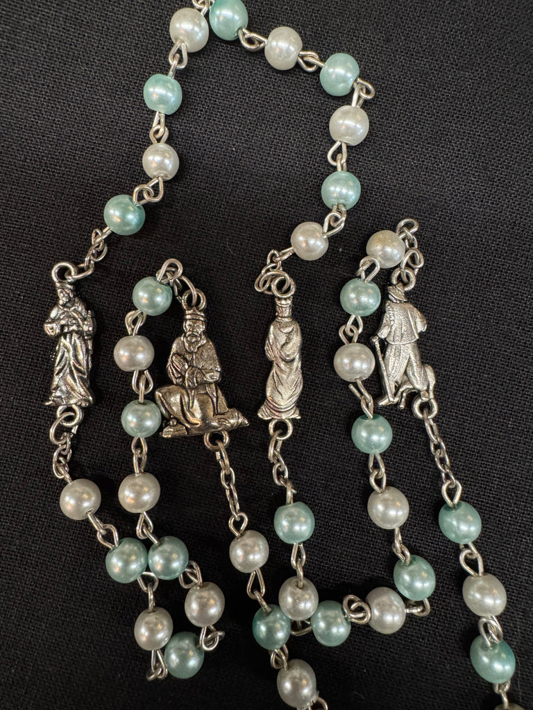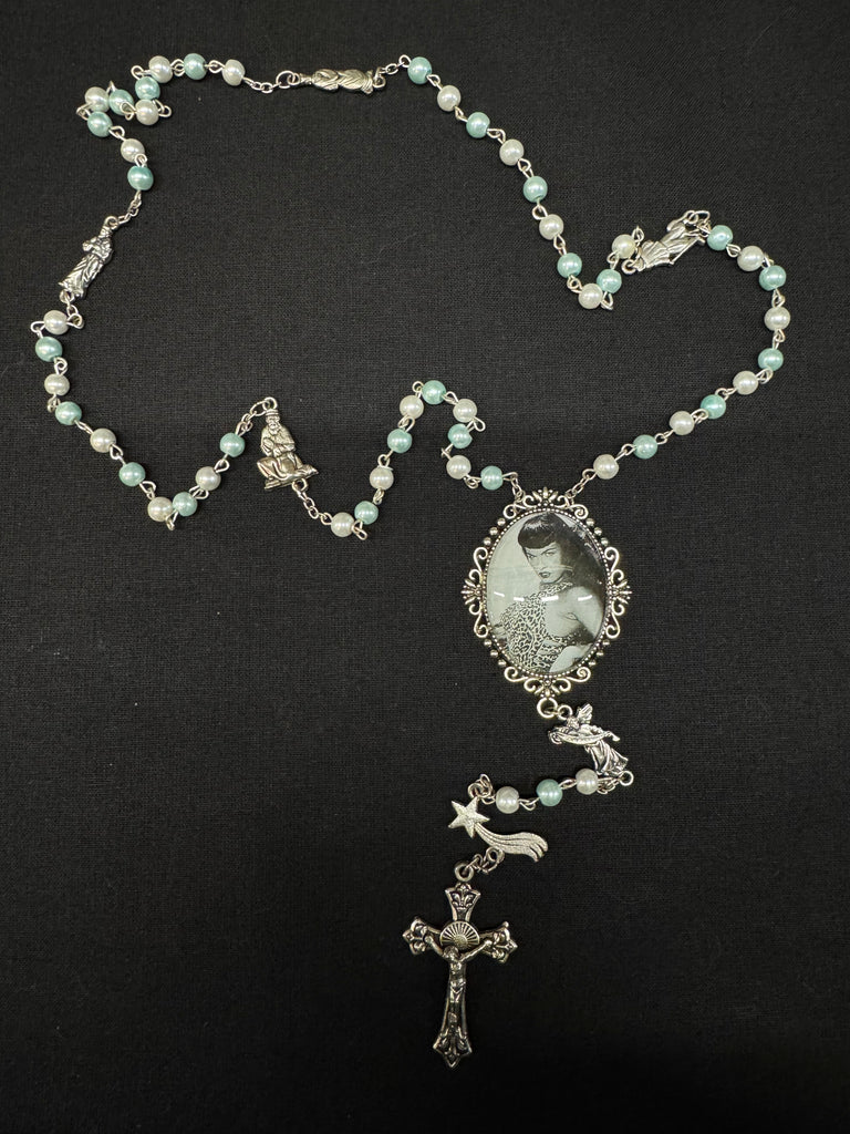 This vintage-inspired rosary features a "Queen of Pin ups" Bettie Page pendant surrounded by Blue and Ivory beads with silver accents.