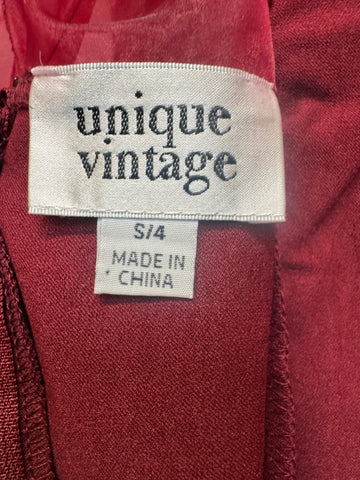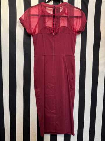 Unique Vintage burgundy "Beaulieu" pencil dress with sweetheart bodice and sheer short sleeve