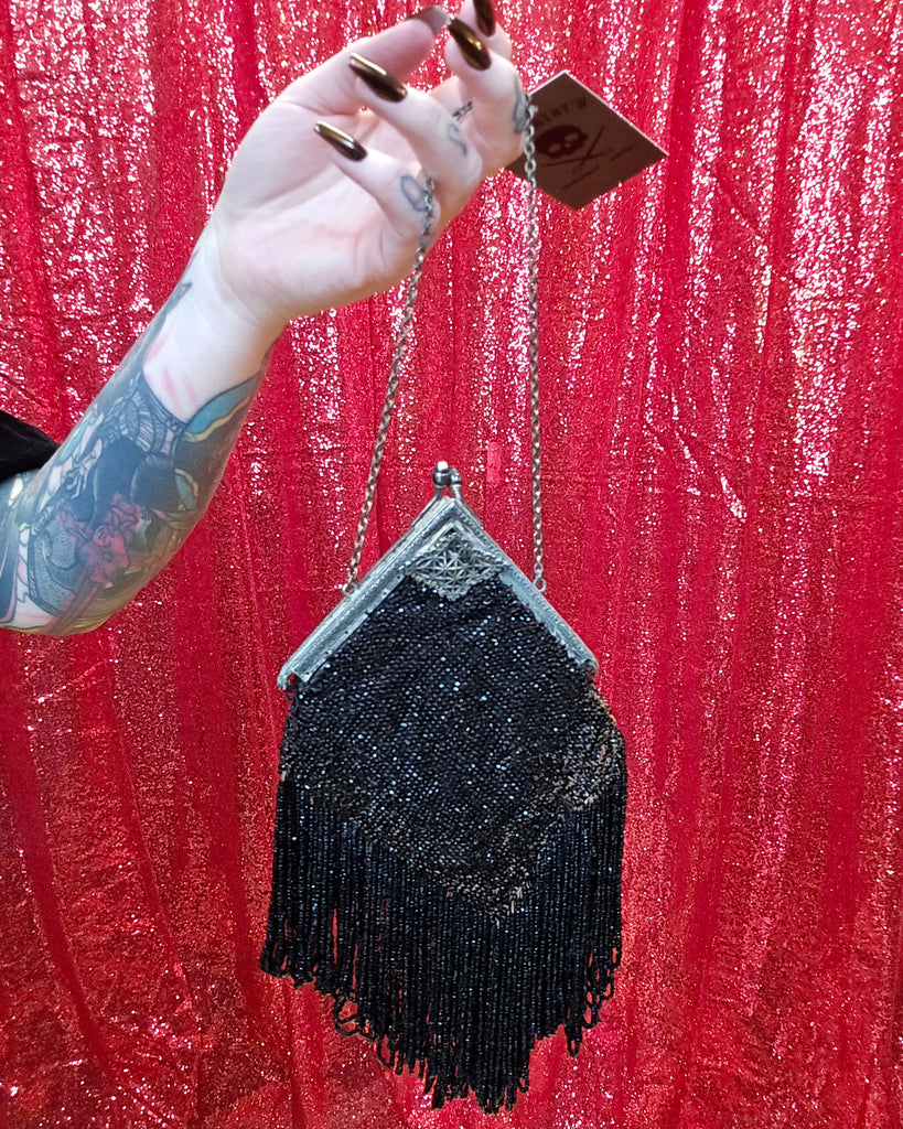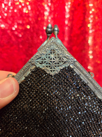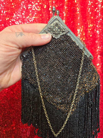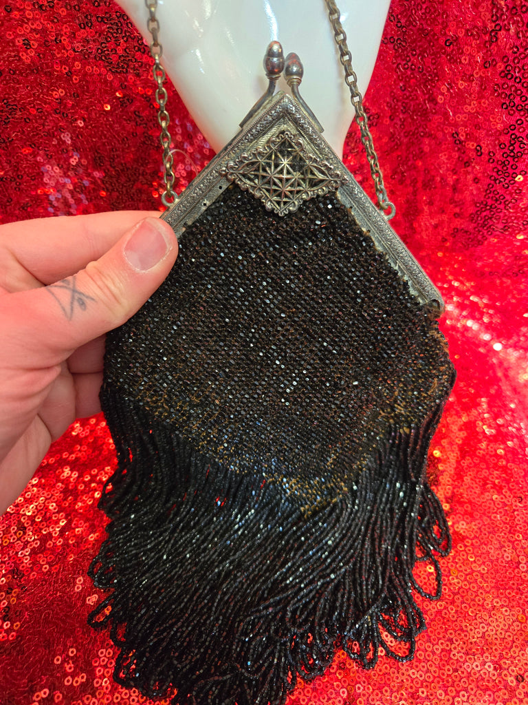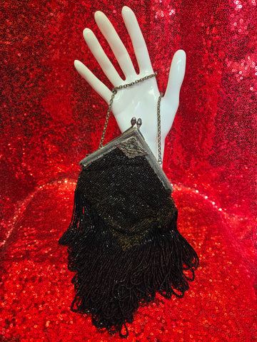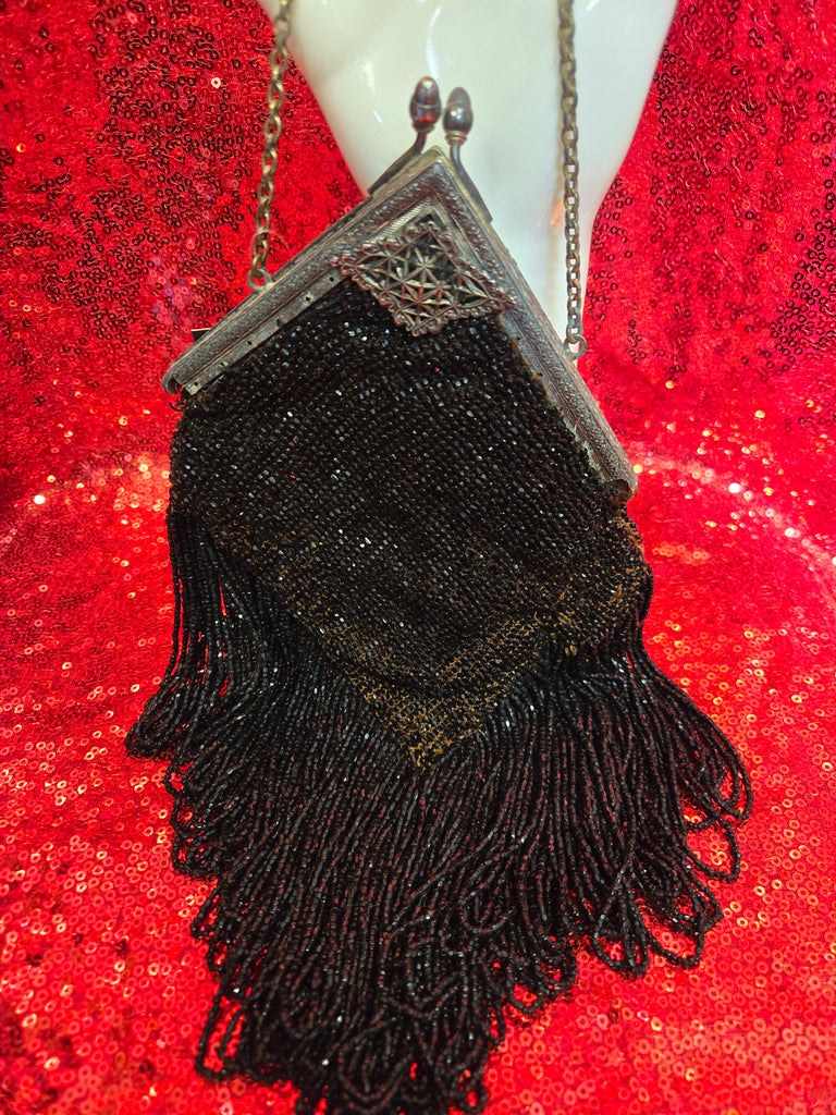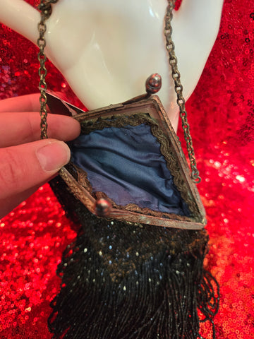 Antique Victorian Glass Beaded purse, with metal clasp, chain handle, and blue silk lining. The purse features black glass beaded loop fringe and an ornate triangular metal clasp. This purse is a heavier bag.