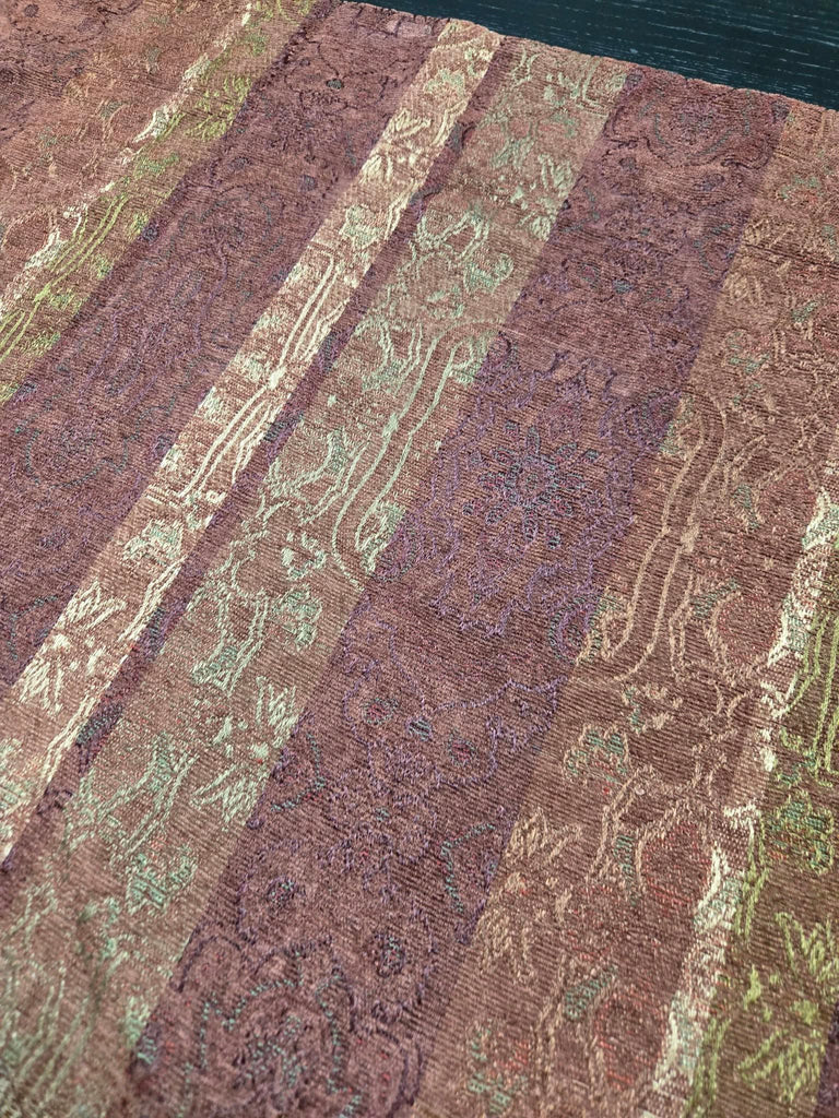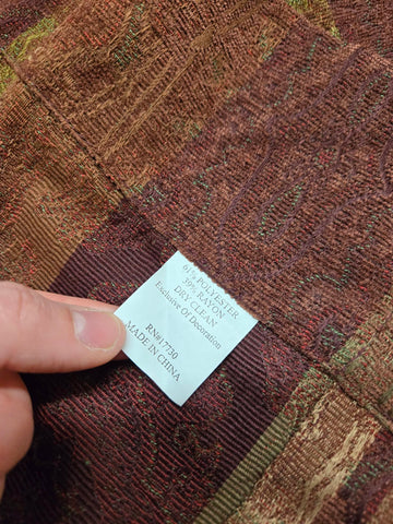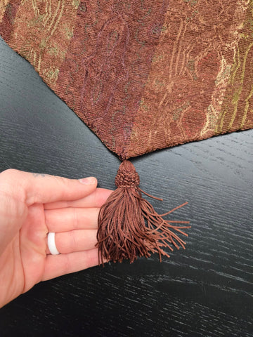Bold Hollywood Regency style with burgundy and gold stripes and a large statement tassel in the center of the this valence style curtain.