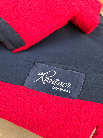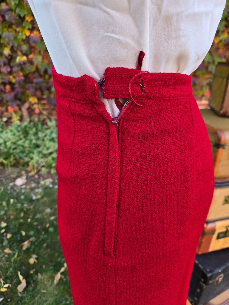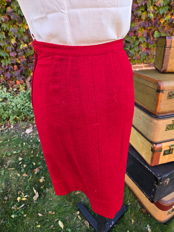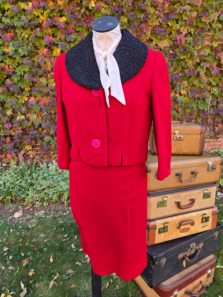 Vintage 1960s red jacket and skirt set with black Persian wool collar. Jacket has large pink button closure and skirt has and metal side zipper.
