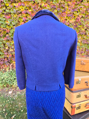 Vintage 1960s navy blue suit jacket blazer with velvet collar. This jacket has a cropped length and button closure.