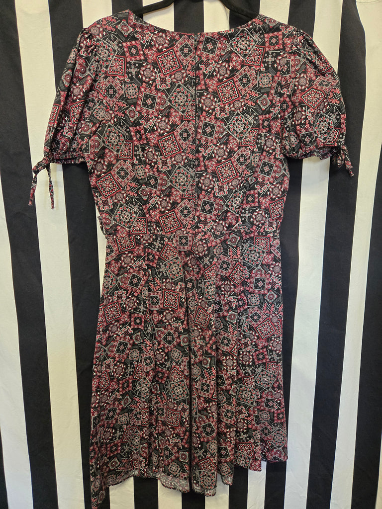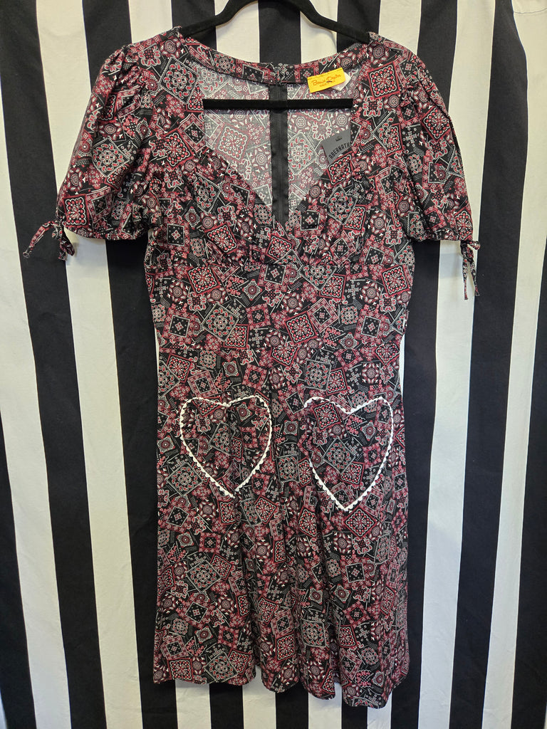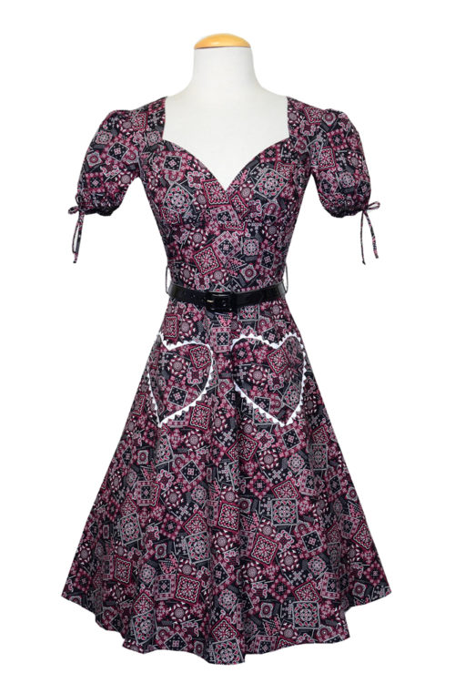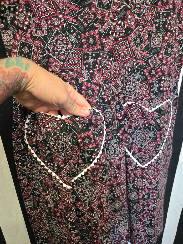 1940s inspired in classic gingham featuring heart shaped pockets, ric rac, elastic sleeves and romantic sweetheart neckline