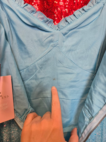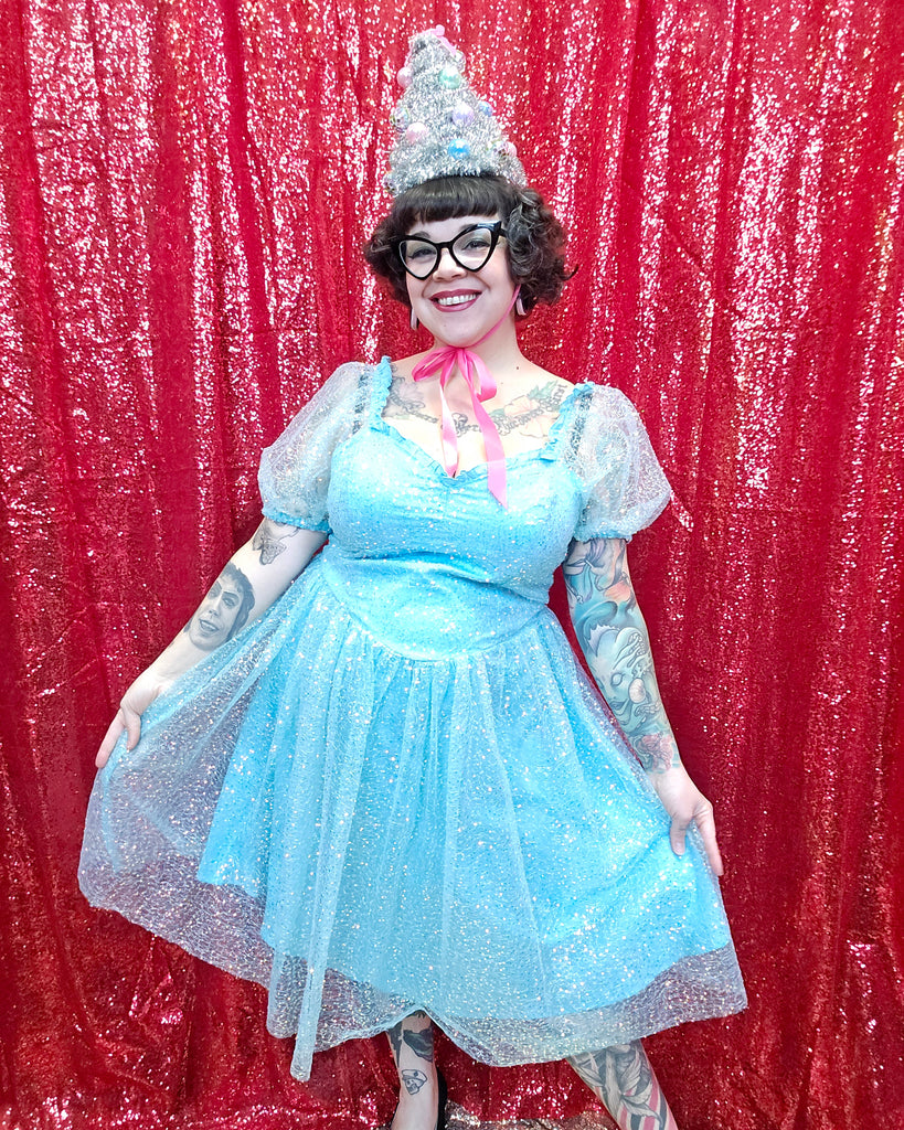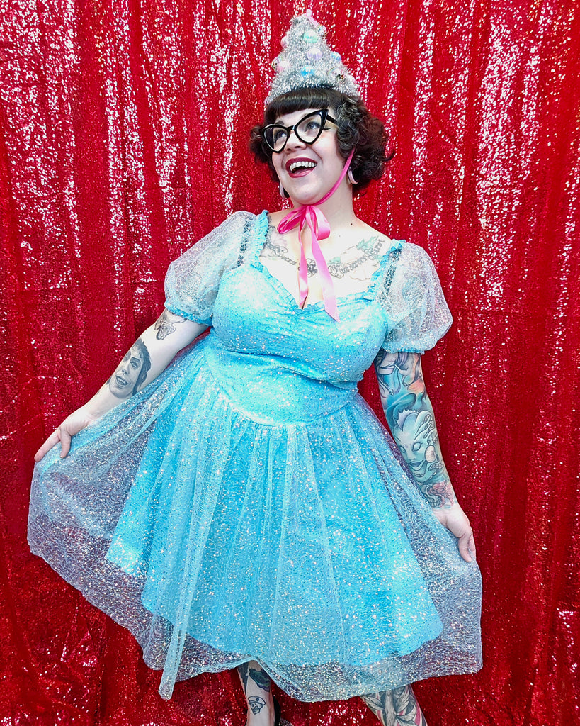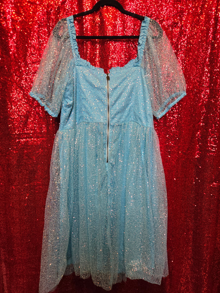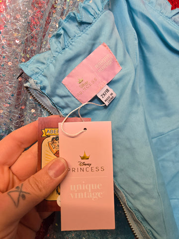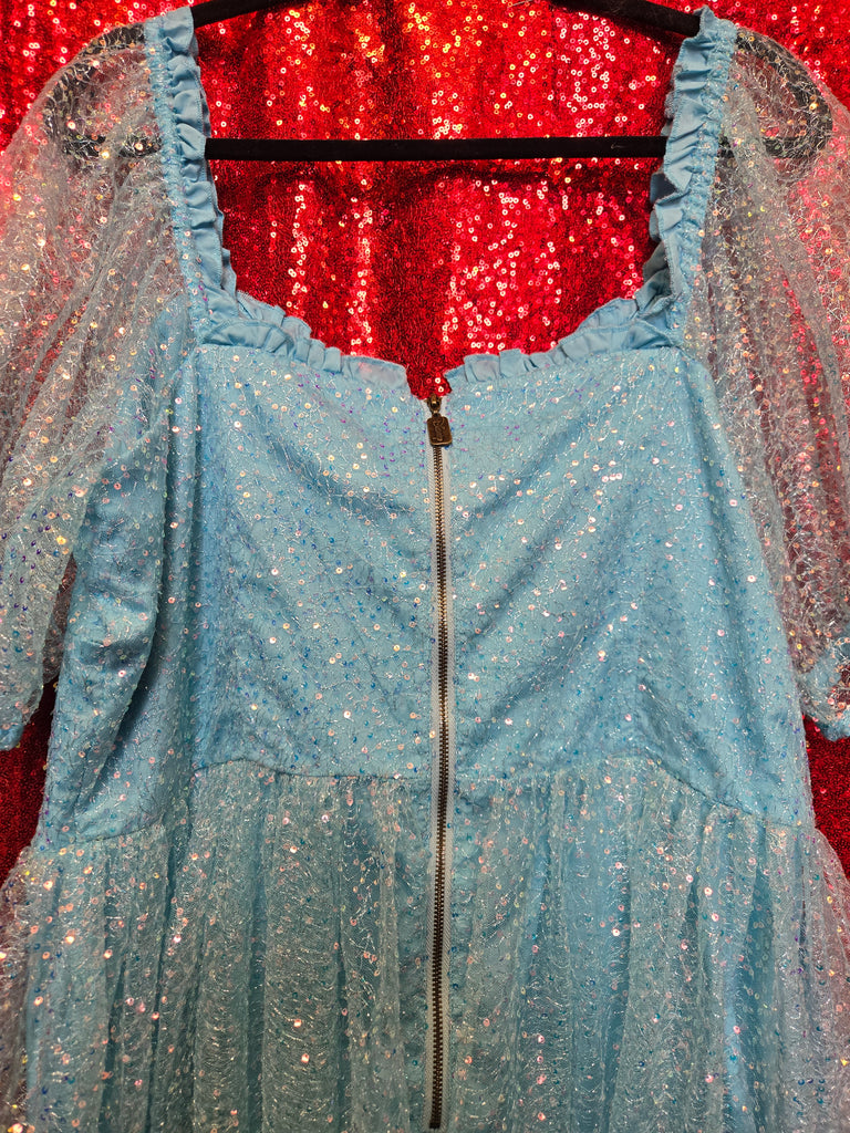 Gently Used Unique Vintage and Disney Princess Cinderella collab dress. This dress features a zipper closure in back, elastic shoulders, and sheer sequin top layer.