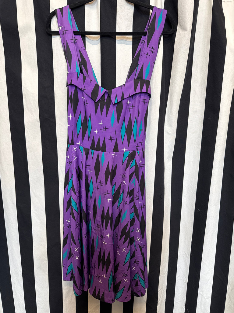 Gently used Sourpuss Haunted Diamonds Veronica Dress. This dress features a sweetheart neckline, crossed shoulder straps in the back, side zipper, and pockets.