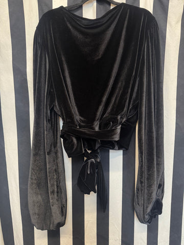 Gently used Laura Byrnes black velvet bishop sleeved cropped wrap top