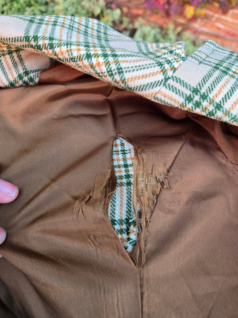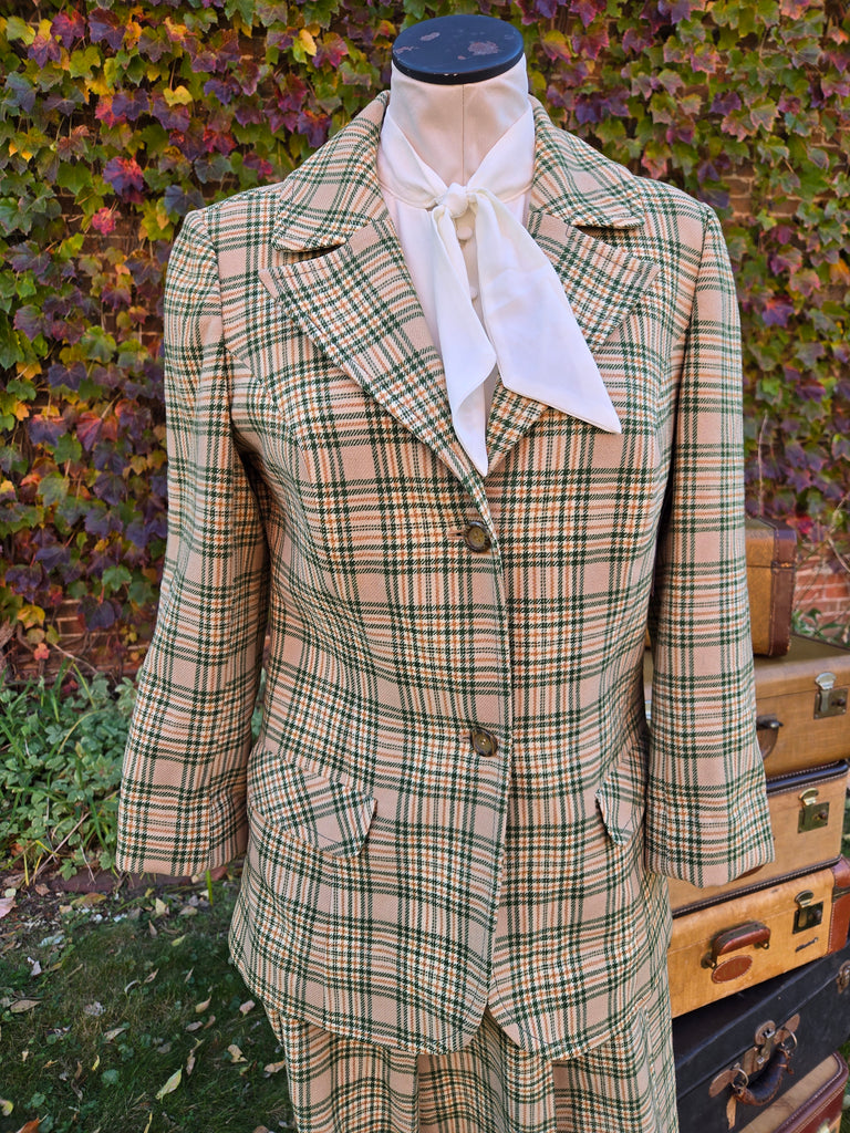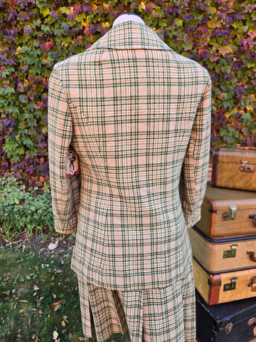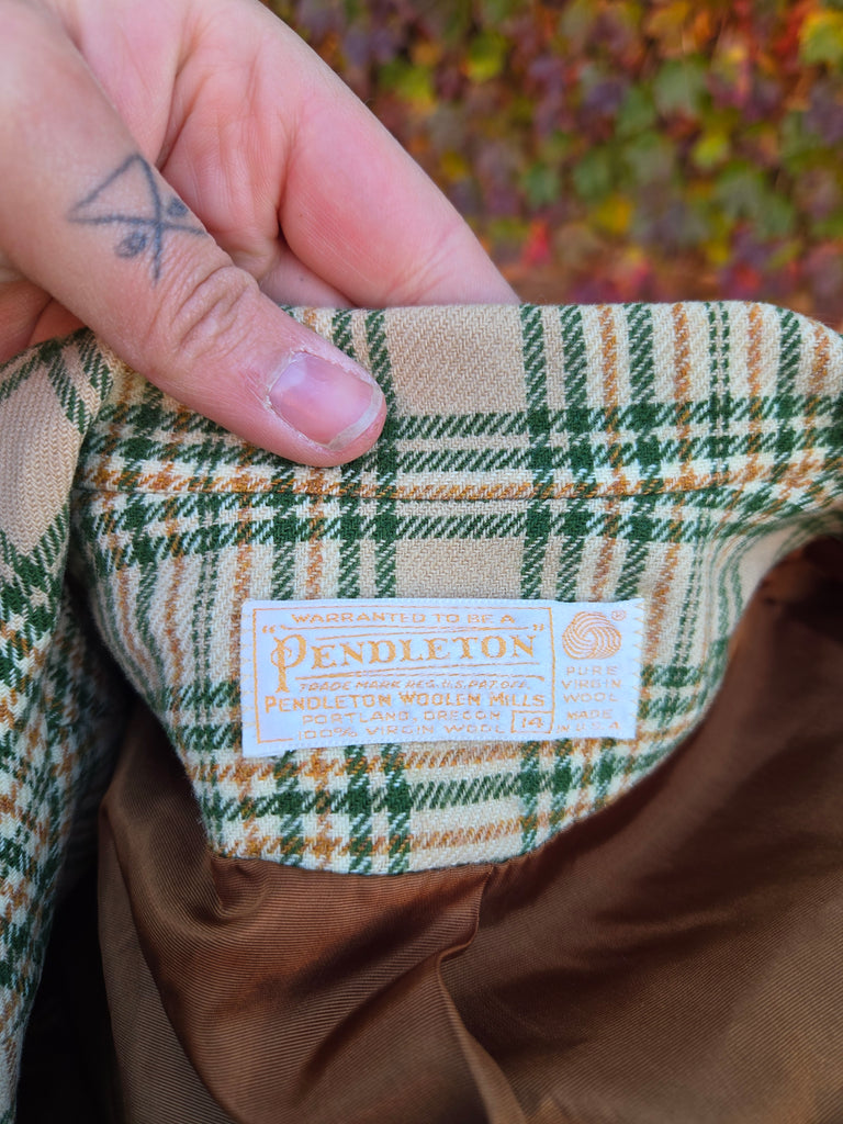 Vintage 1970s yellow and green plaid Pendleton suit set with jacket and skirt. Jacket features shoulder pads, pockets, and button closure. Skirt features plastic zipper closure in back.