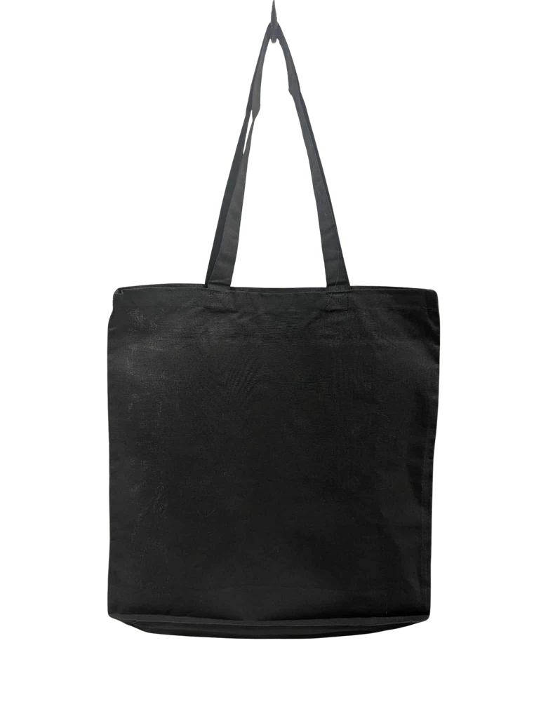 Made from durable 100% cotton sheeting, this tote has a roomy 3-inch gusset and measures at 15" x 16" with 21" handles.