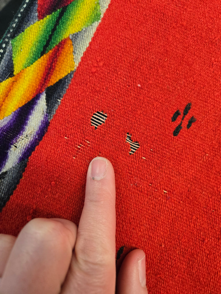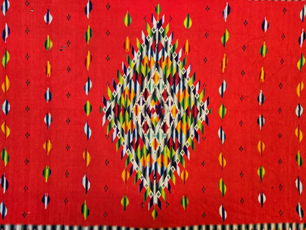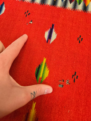 Real wool serape Mexican blanket with a rainbow of colors in the stripes and geometric design.