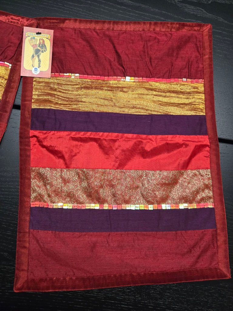 Set of two red sequin pillow covers with stripes of metallic gold, purple, and red.