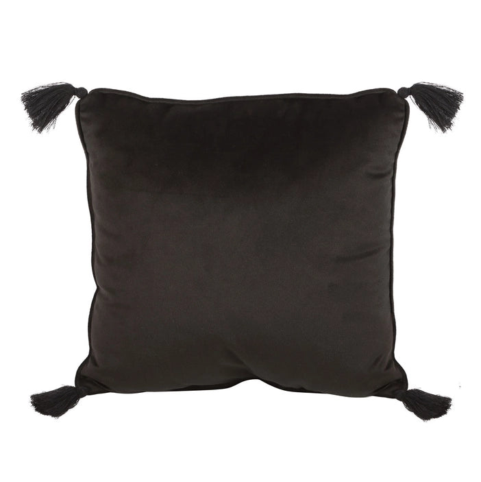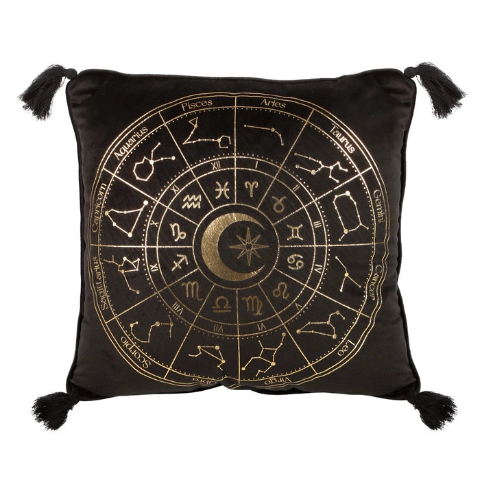 Add a touch of celestial elegance to the home with this Astrology Wheel square cushion. This black cushion features a metallic gold finish adorned with black tassels for a stylish and cosy addition to any room.