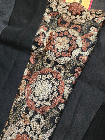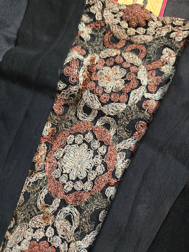 Antique black silk drop waist Flapper Dress with with, red, and brown embroidery panel in front. This dress features snap closure at the wrist, bow accent on the waist, and no waist closure.
