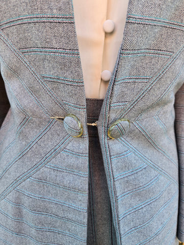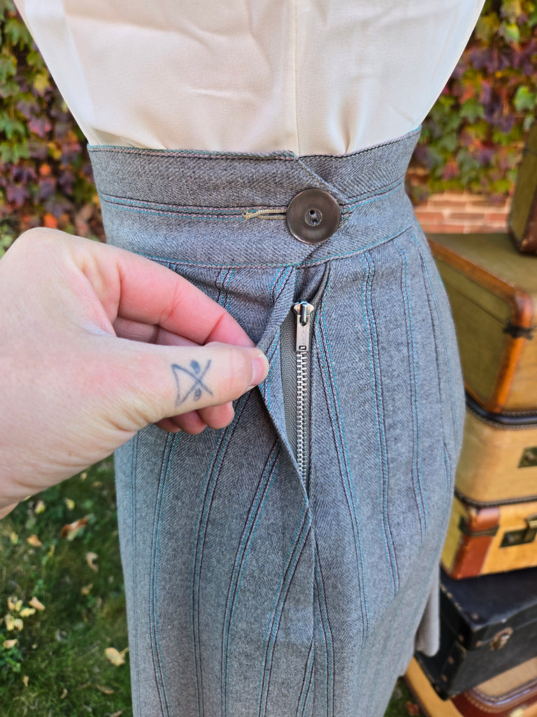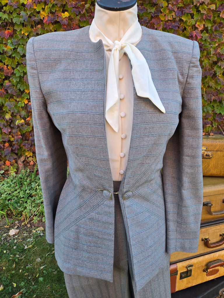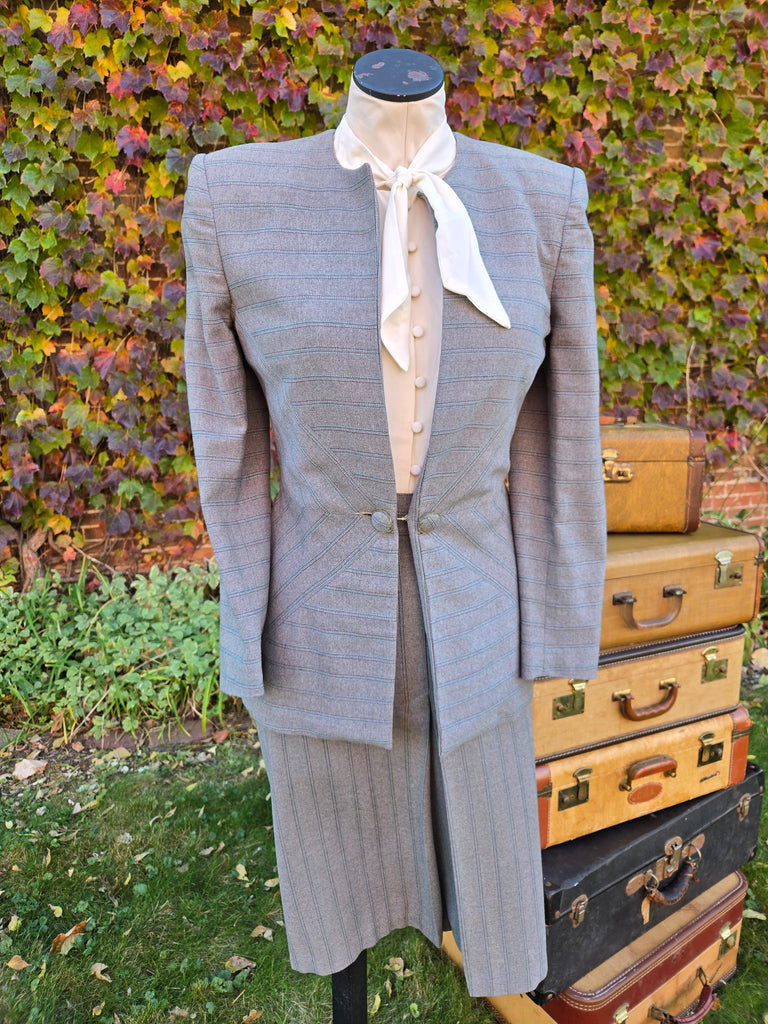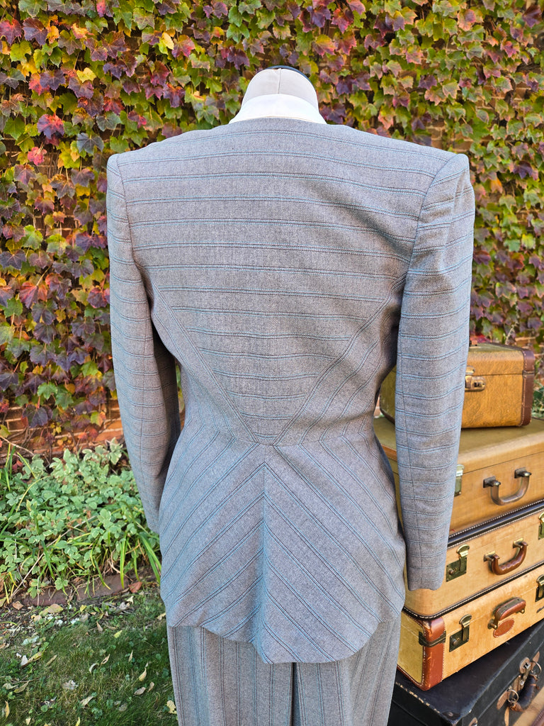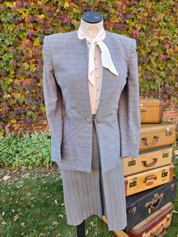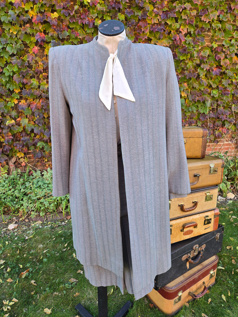 Vintage 1940s gray pinstriped Suit set with jacket, overcoat, and skirt. Overcoat has large shoulder pads, jacket has shoulder pads and button closure, skirt has metal zipper closure.