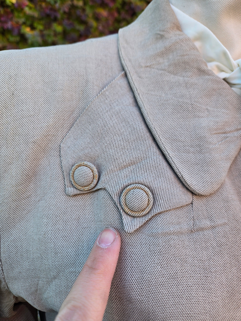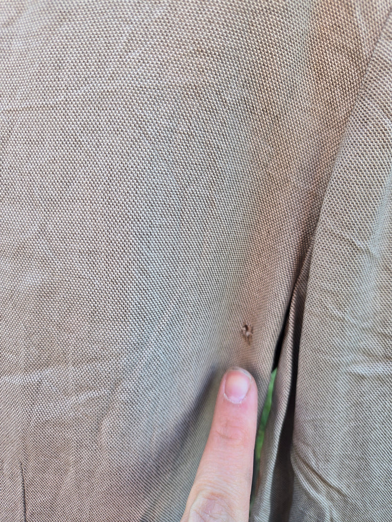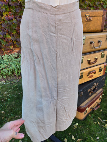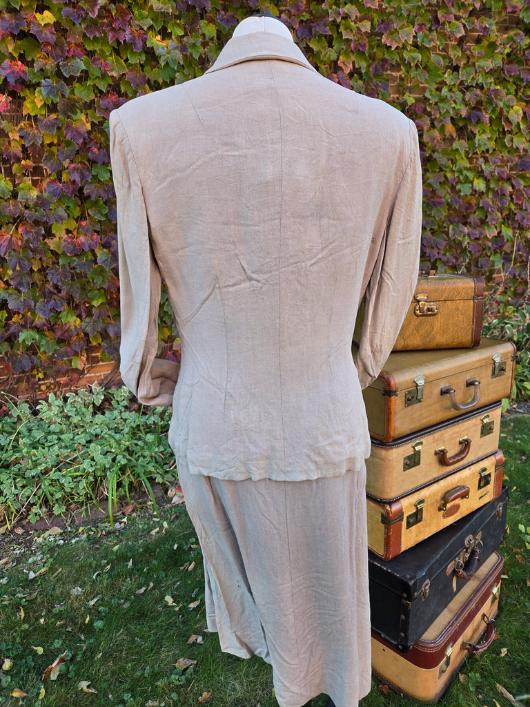 Vintage 1940s light brown linen jacket and skirt suit set. Jacket has button closure and faux button accents on bust and faux pockets. Metal side zipper closure on skirt.