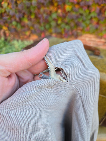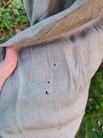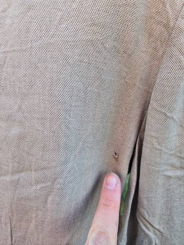 Damage: moth holes throughout, rust stains on buttons, hole near zipper on skirt