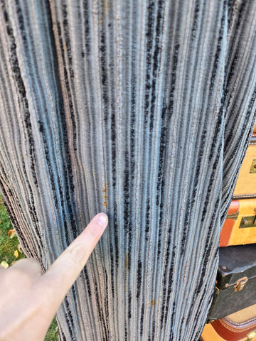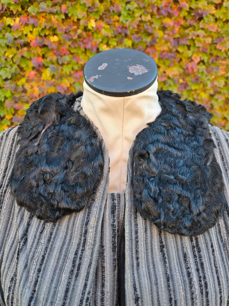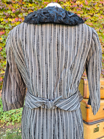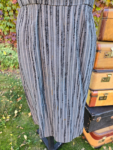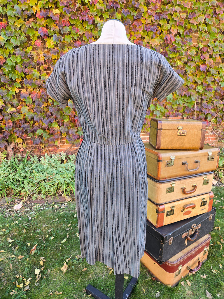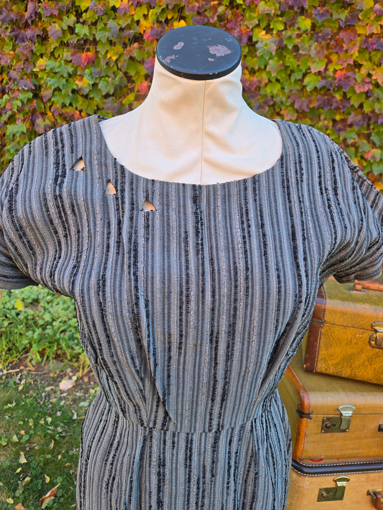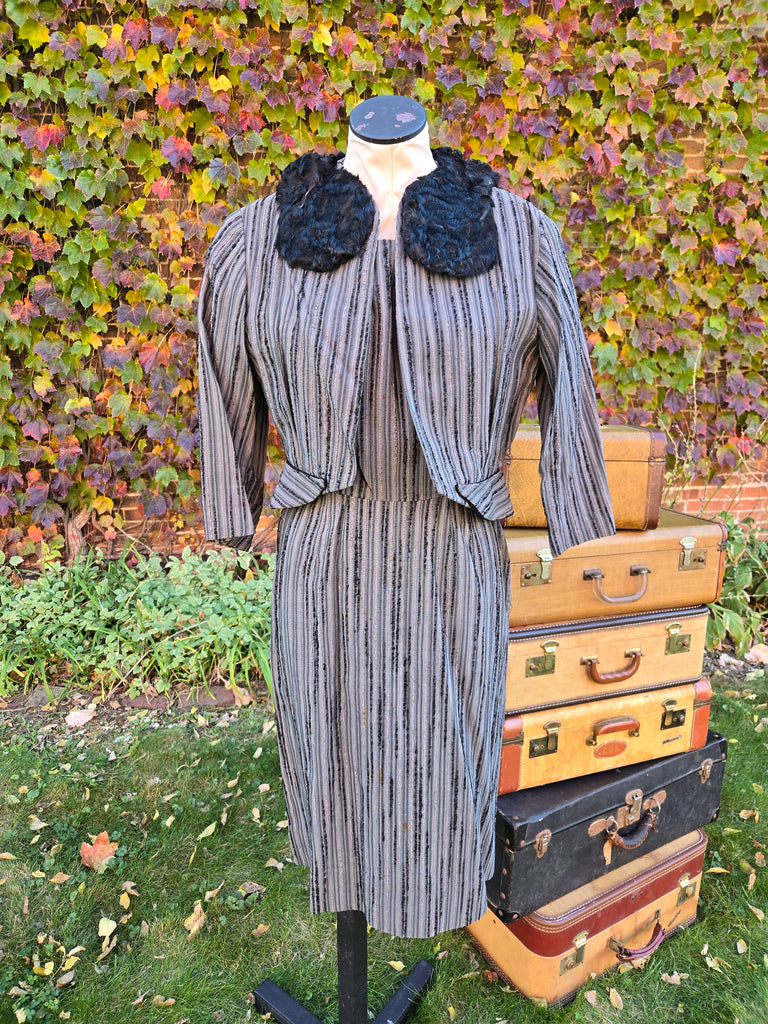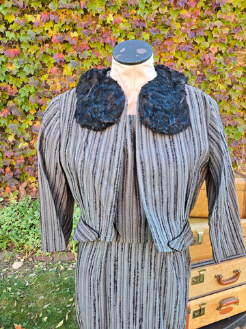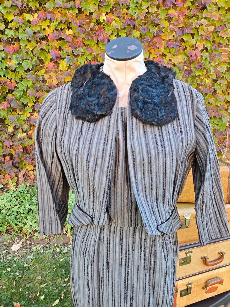 Vintage 1950s gray and black stripe dress and jacket set. Dress features triangle cut outs along the bust and metal side zipper. The jacket features Persian Wool Collar and waist band with bow in the back.