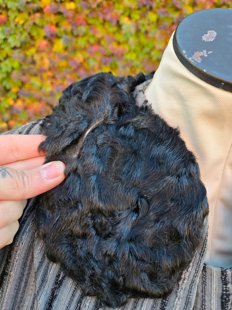 Damage: staining on skirt of dress and hide is showing on collar of jacket