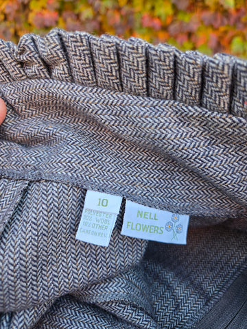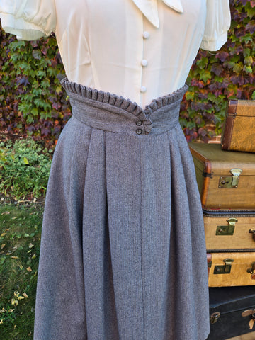 Vintage 1980s inspired by the 1940s gray herringbone jacket and skirt set. Jacket and skirt both have a ruffle trim. Jacket has hidden button closure and skirt has a plastic zipper in back.