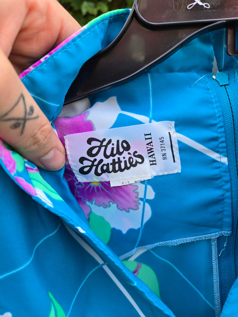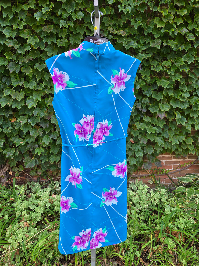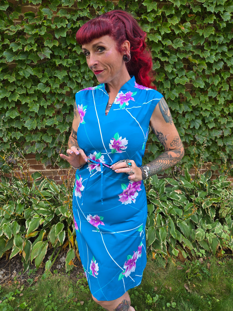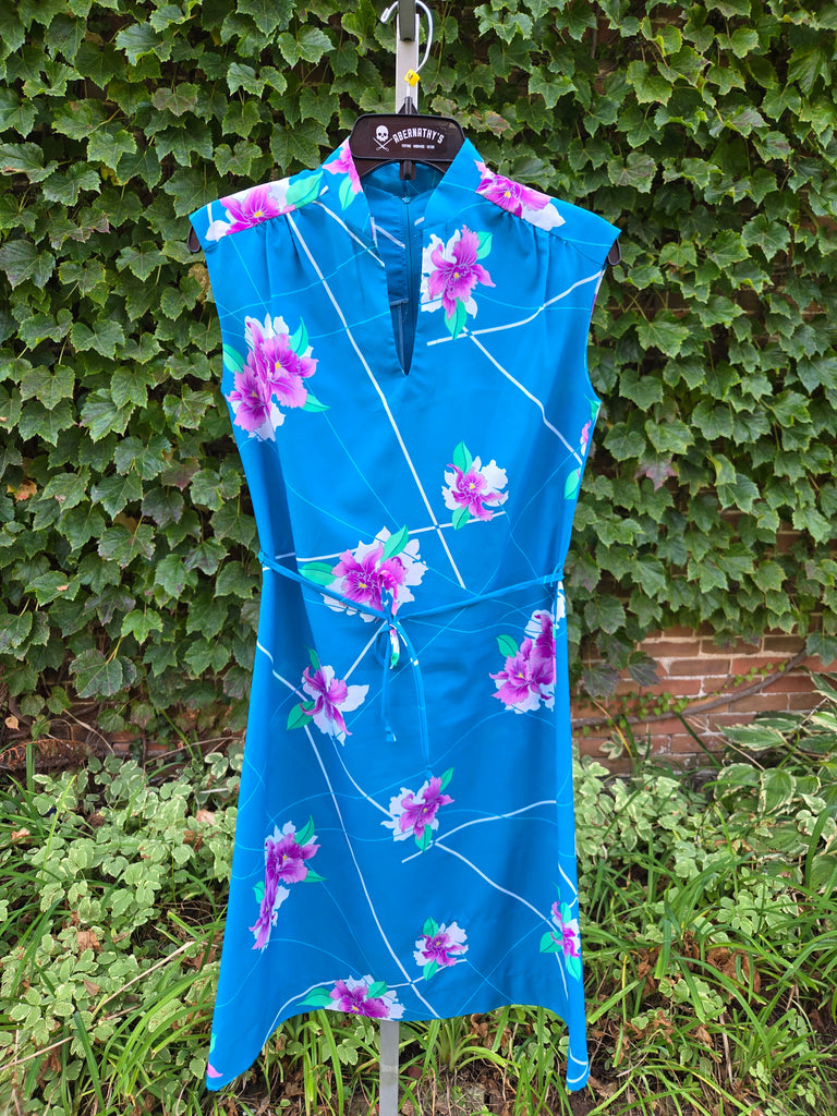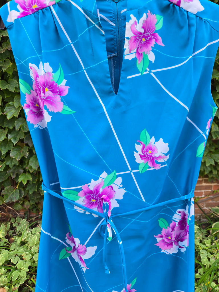 Vintage 1970s teal blue sleeveless dress with purple and white orchid print, zipper closure, and tie belt
