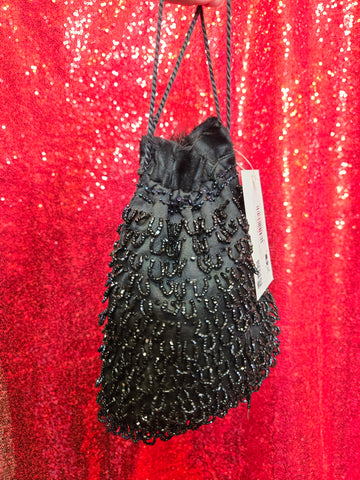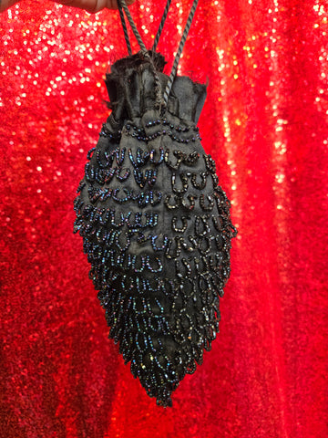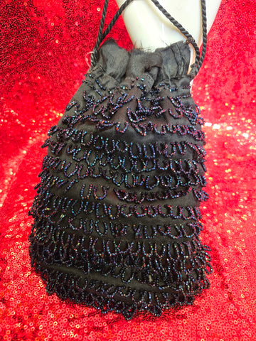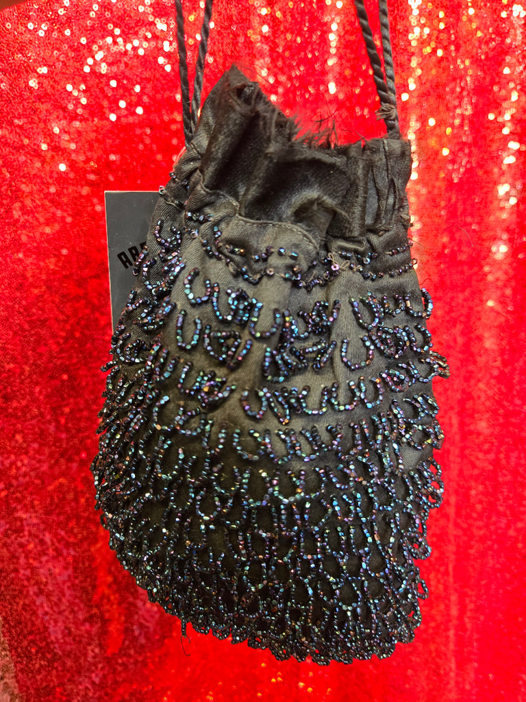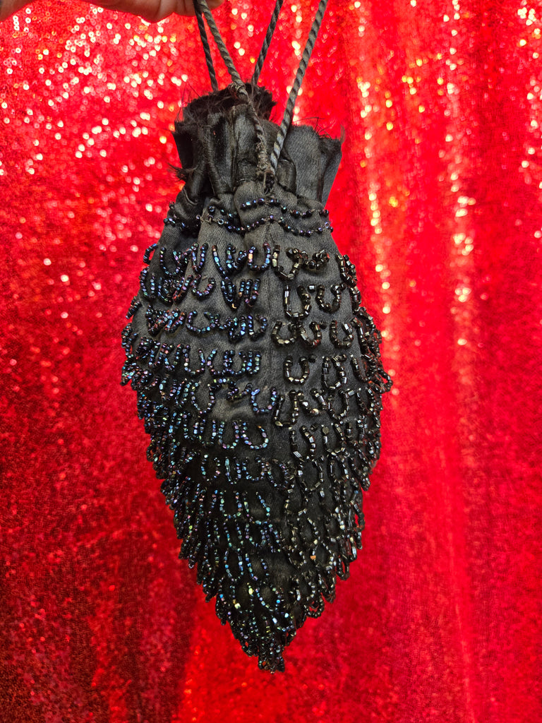 This little cutie pie is a gorgeous double-sided bag with hand-beaded iridescent blue on one side, and obsidian black on the other side. The beading is all brought together with a dark iridescent accent just below the drawstring. This bag does have a raw hem at the opening, probably not intentional but adds vintage love to it even more.