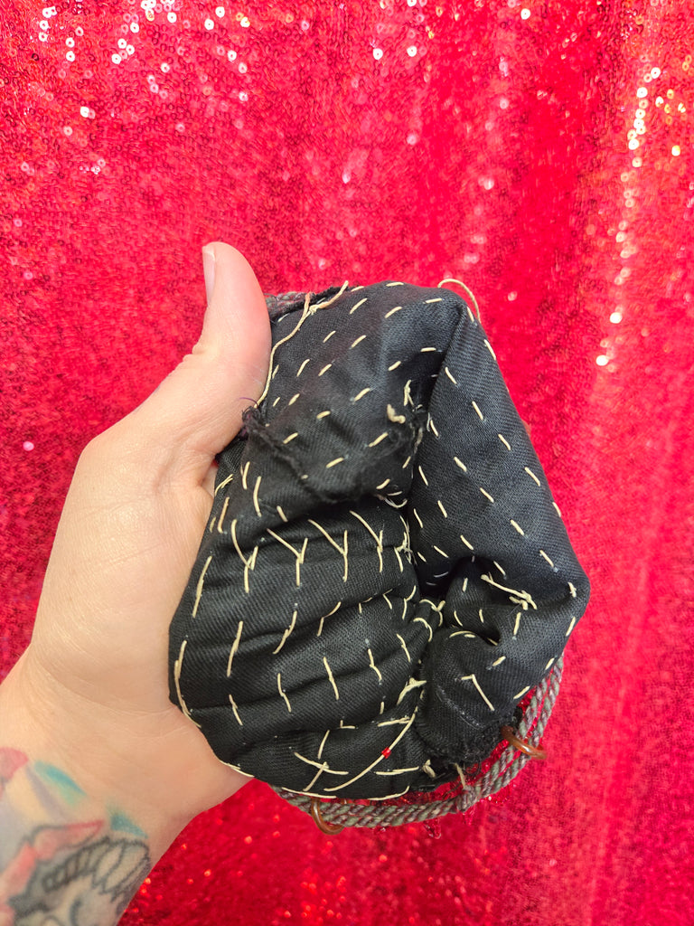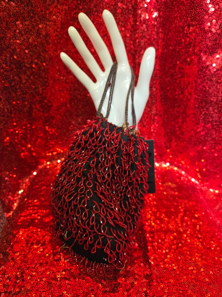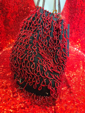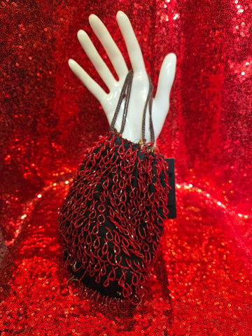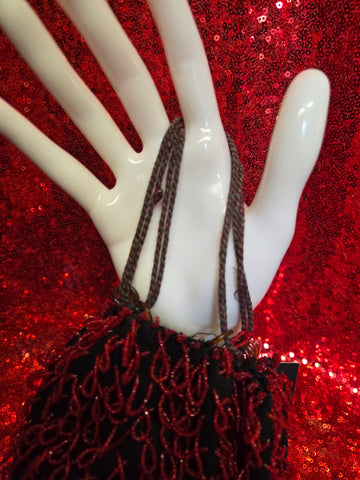 This cute little 20s bag is the perfect pop of color or addition to any red outfit! It's a total classic with red, hand-beaded looping motifs against a black fabric background, and a drawstring closure. It has orange lucite loops for the red and gray drawstring to easily close. It's also got a cute little bobble on the drawstring!