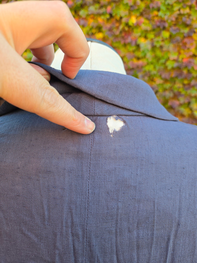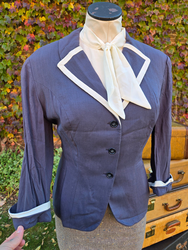 Vintage 1950s blue gray linen Sailor style Jacket with white stripe detail. This jacket features shoulder pads, button closure, and pockets.