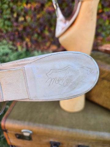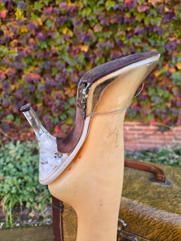 Vintage 60s clear lucite mule Heels with elastic insoul, clear toe band, and rose carved lucite heel.