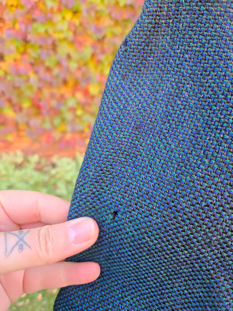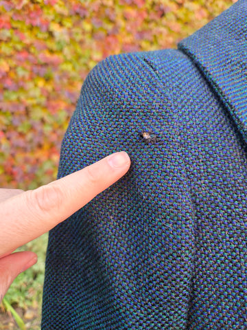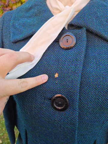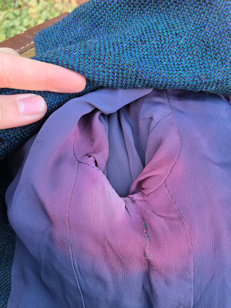 Damage: moth holes throughout, including one on the bust. Staining under arms in lining.