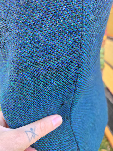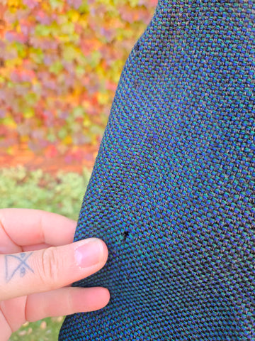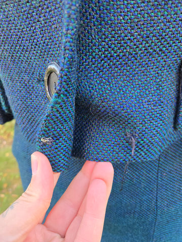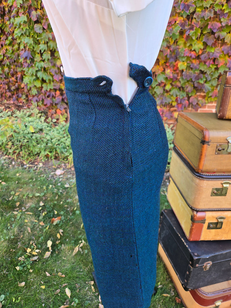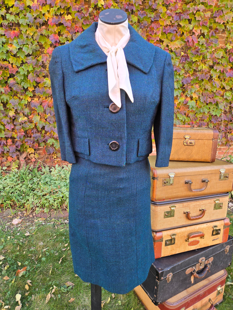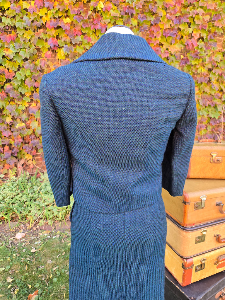 Vintage 1960s blue wool knit jacket and skirt suit set. Black button closure on jacket and metal zipper closure on skirt.