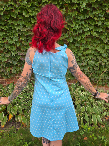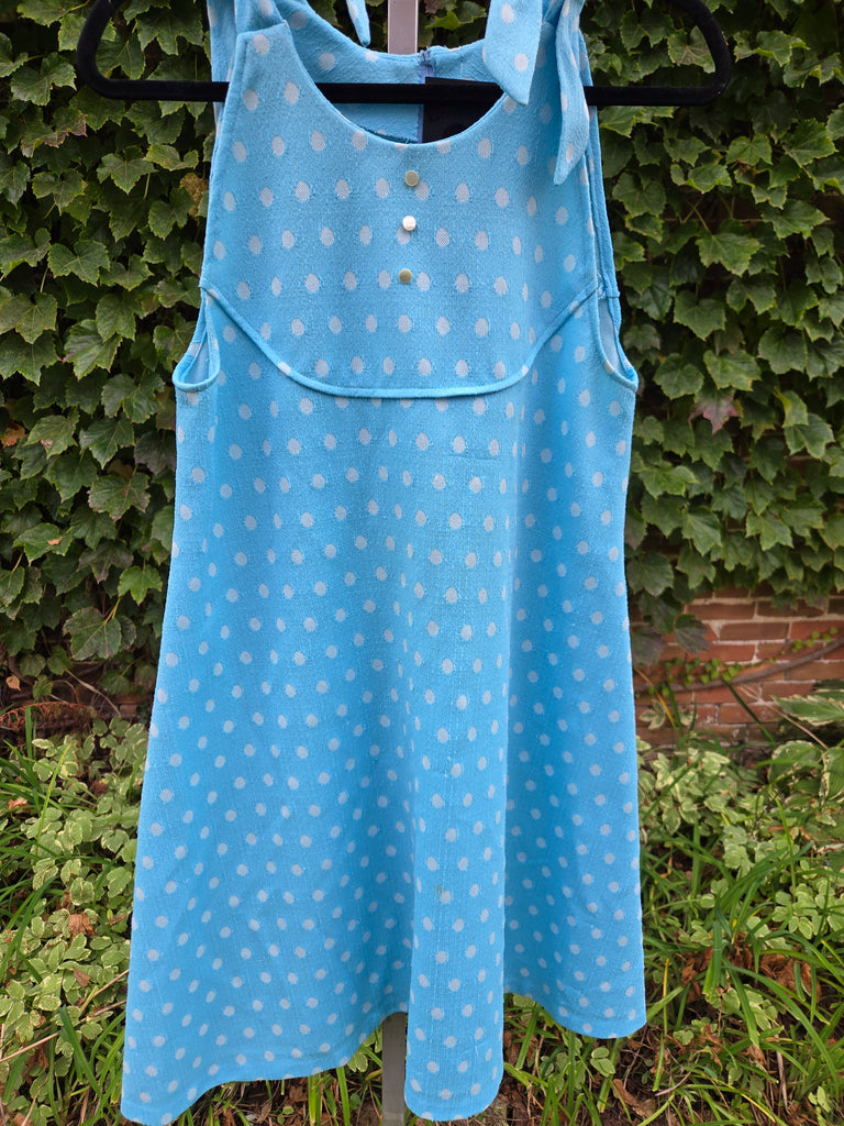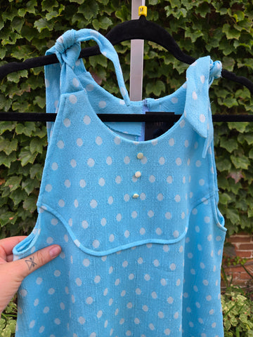 Vintage 1960s pastel blue with white polka dots trapeze dress with ties at shoulders and faux buttonsSize: MDBust: 36"Waist: openFabric: polyester Lining: noneDamage: staining throughout