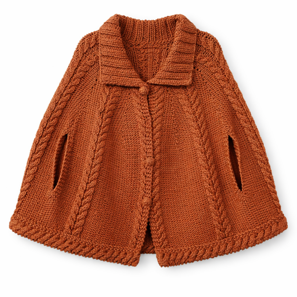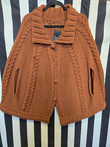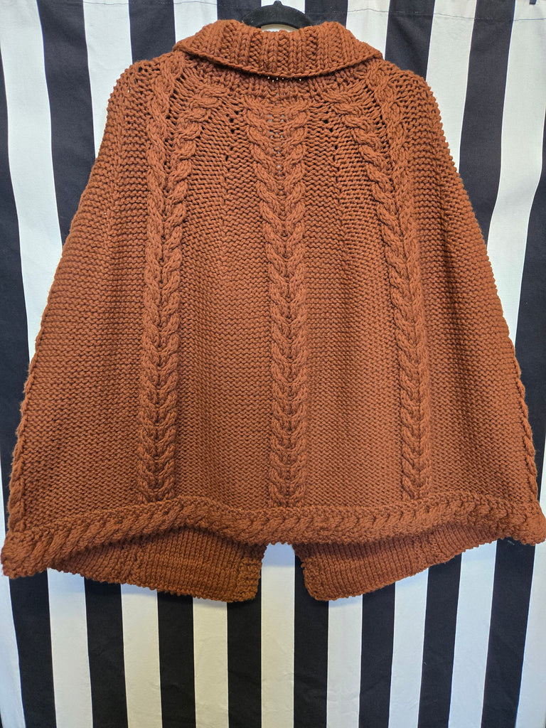 Vintage 60s brown red hand knit cape with arm holes. This cape features fabric covered faux buttons with snap closures underneath.