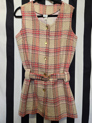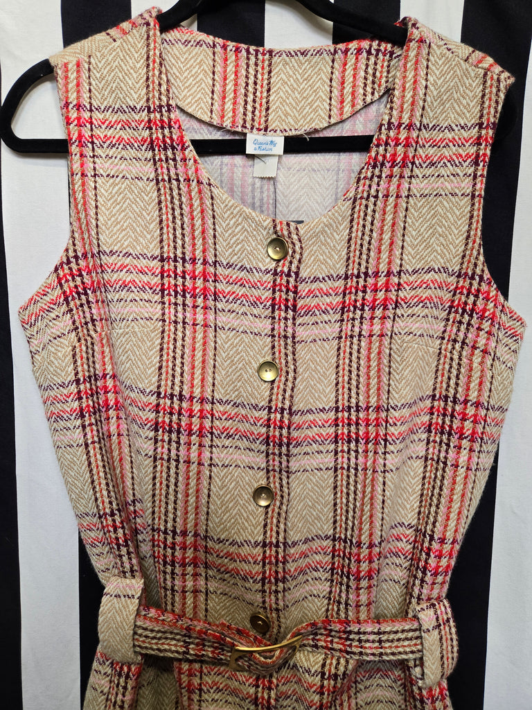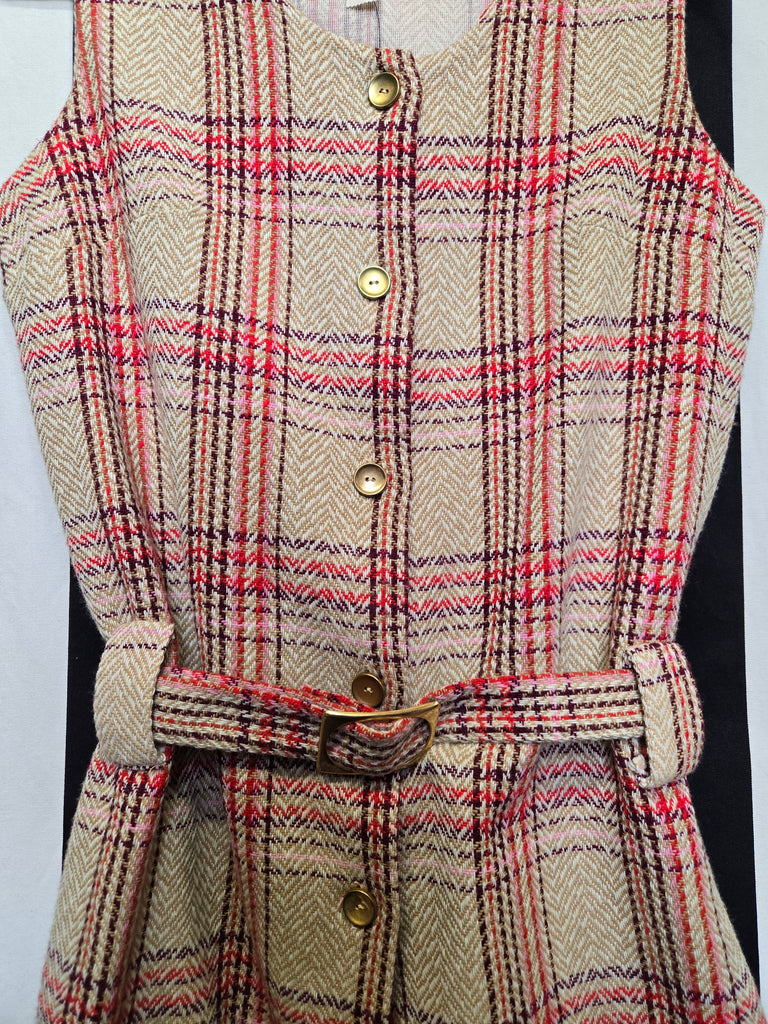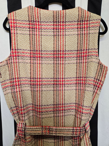Vintage 1970s tan red pink and purple plaid vest with belt. This vest features gold button closures.