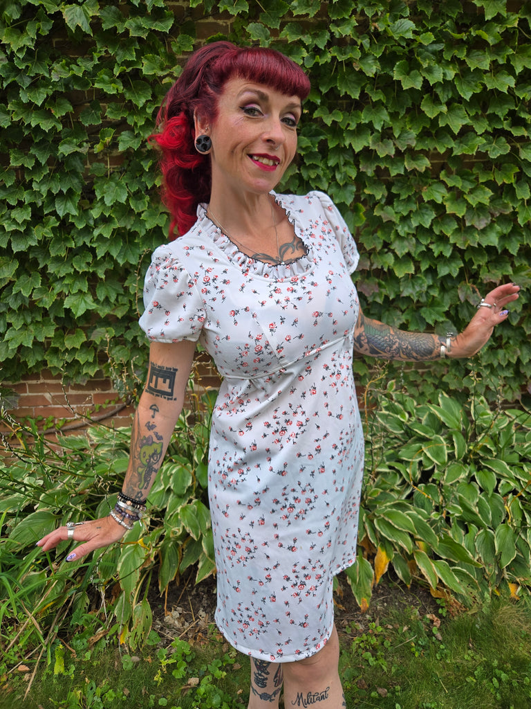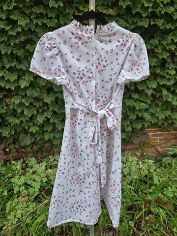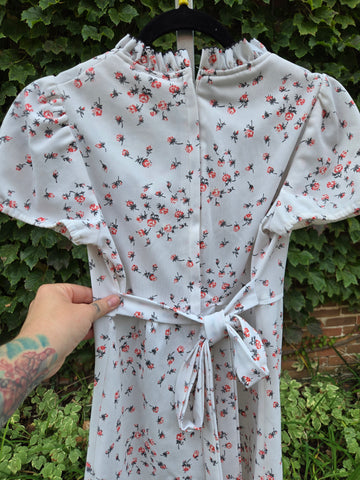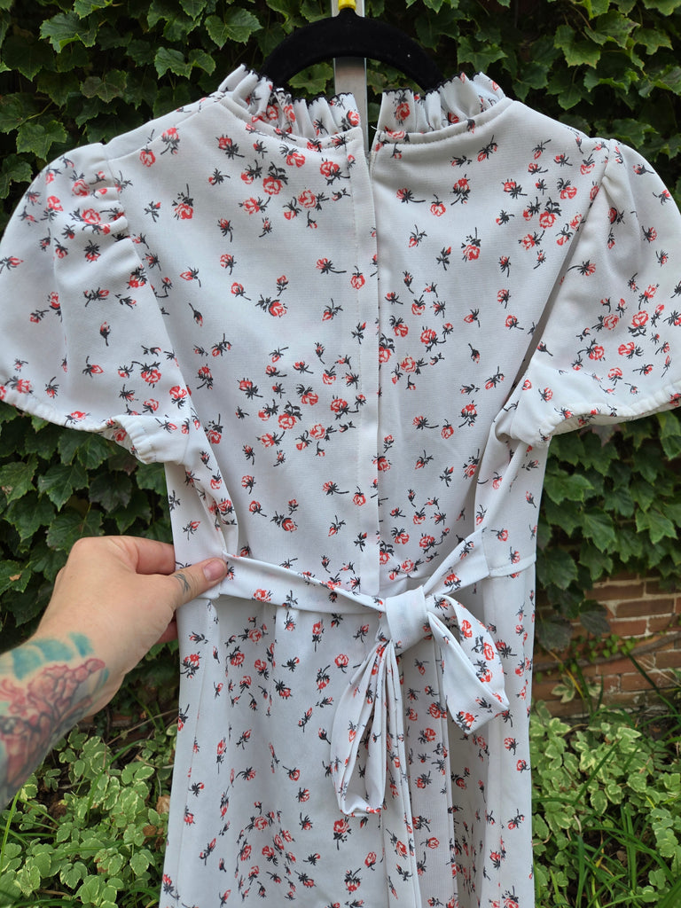 Vintage 1960s white mini dress with red roses. This dress features a ruffle collar, puff sleeves, and tie belt.