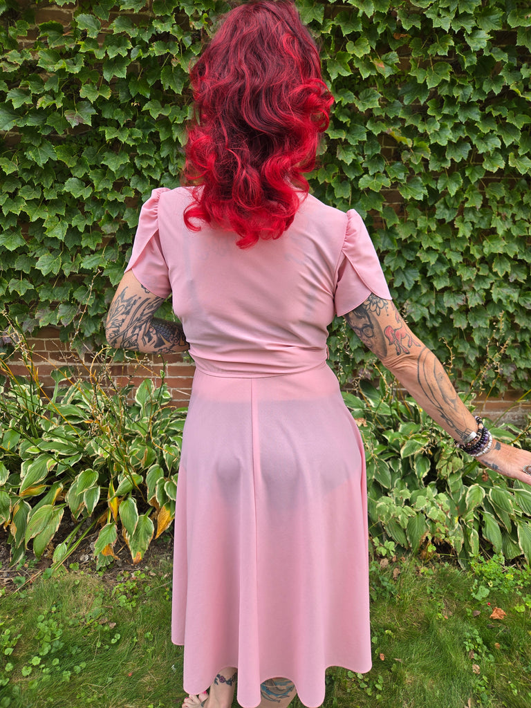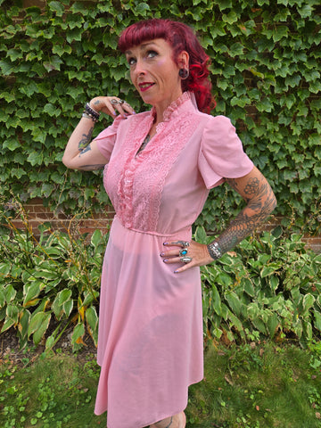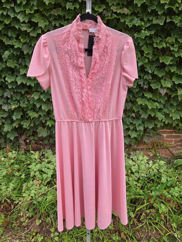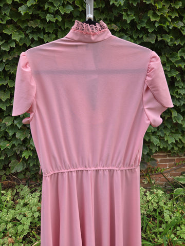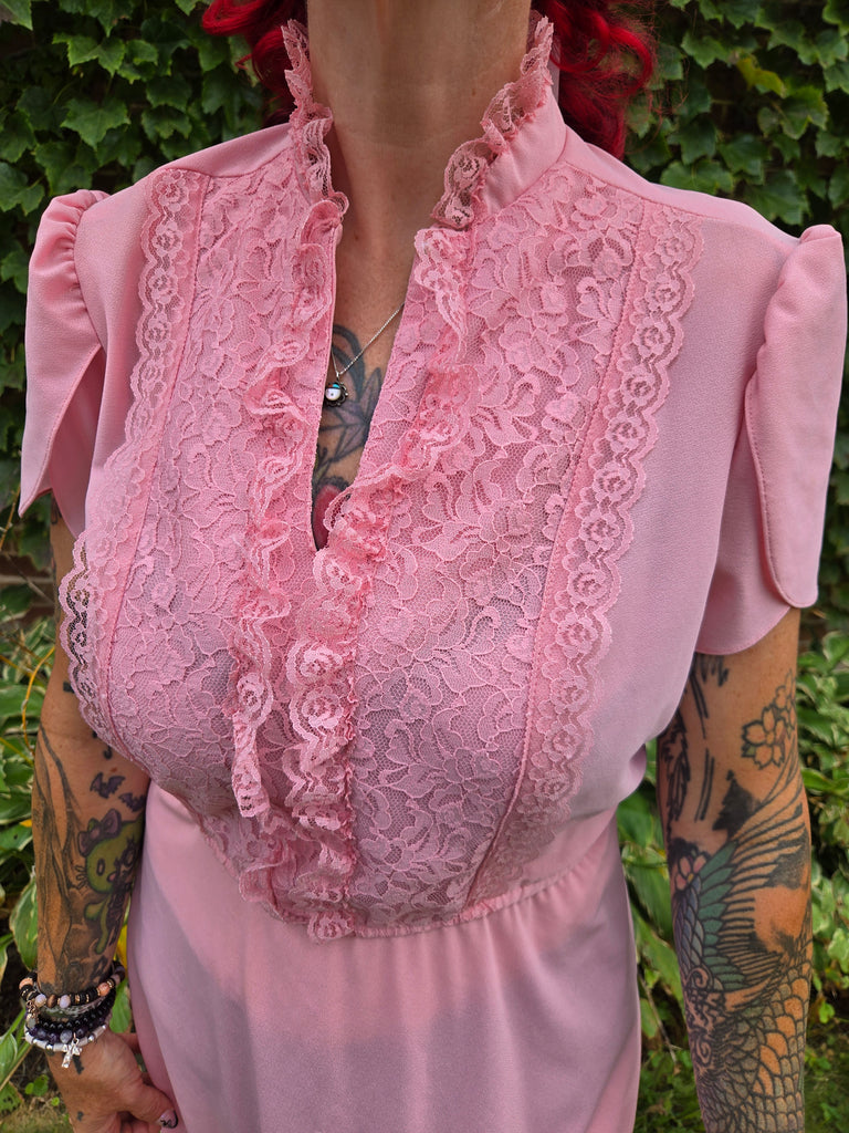 Vintage 1970s Pastel dusty rose pink dress with lace ruffle bust and collar, scalloped sleeves, keyhole neckline, and elastic waist
