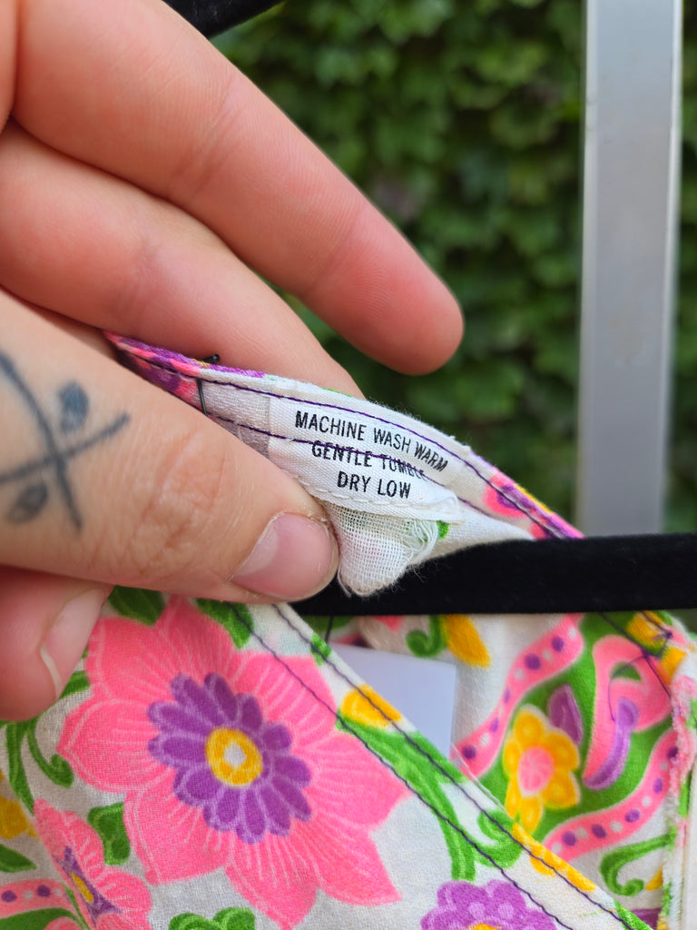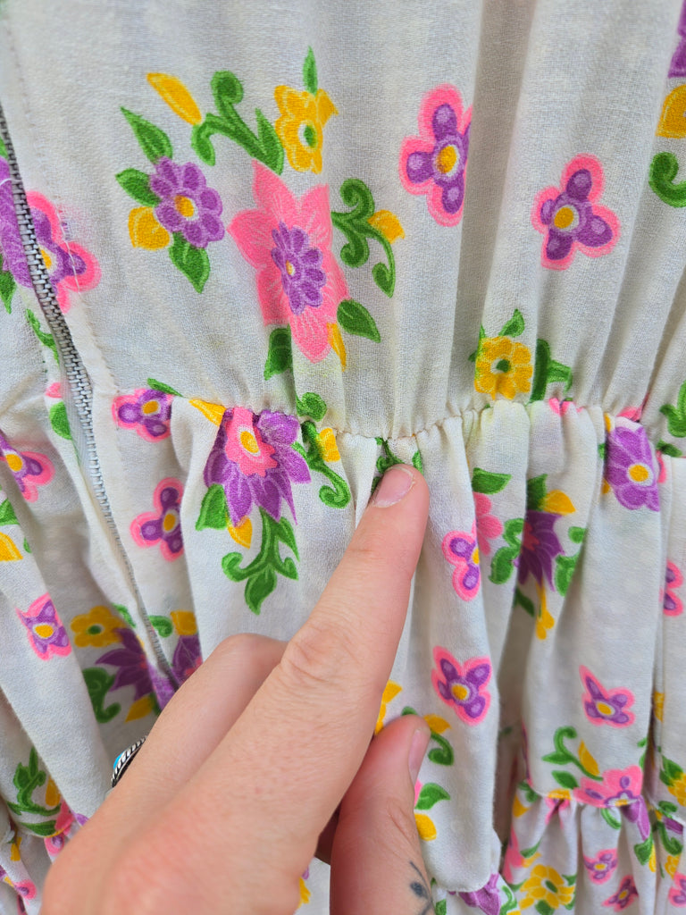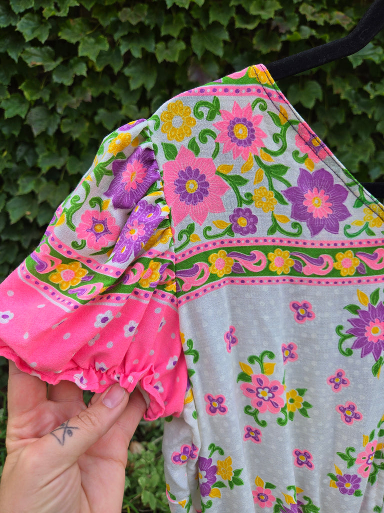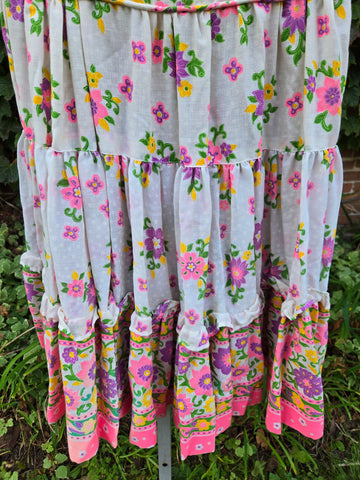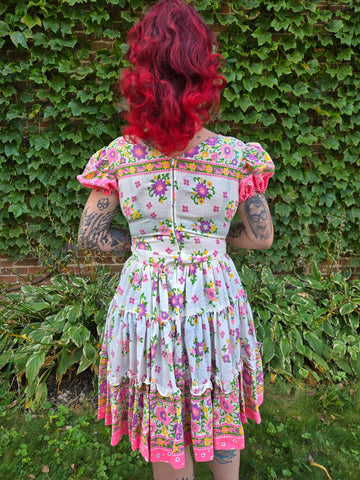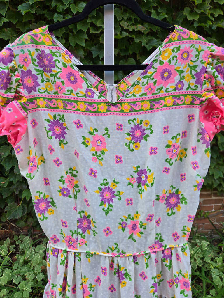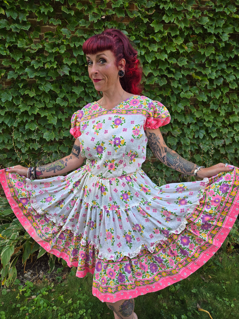 Vintage 1970s square dancing dress in pink, green, purple, and yellow floral print with puff sleeves, circle skirt, and zipper closure in back