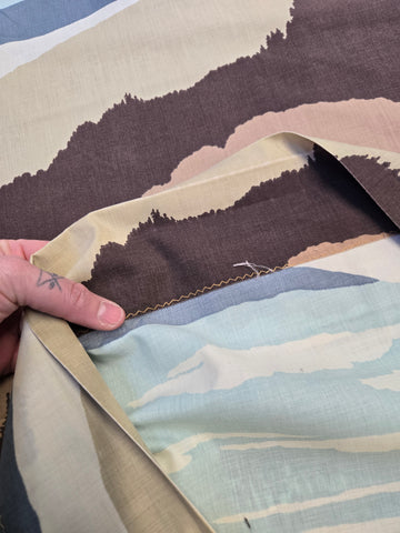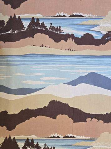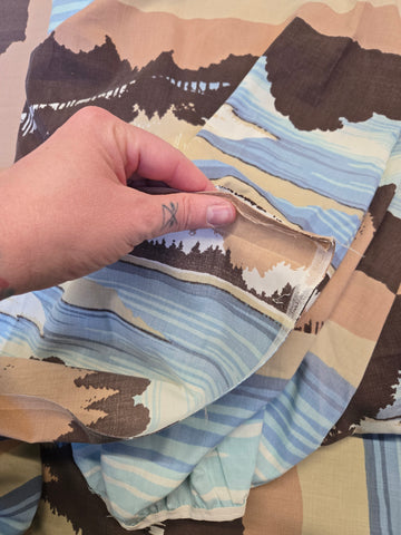 Handmade sheet set for a double bed that featuring the skyline including pine trees, mountains, and the sky. This set includes one flat sheet and one fitted sheet for a double bed.