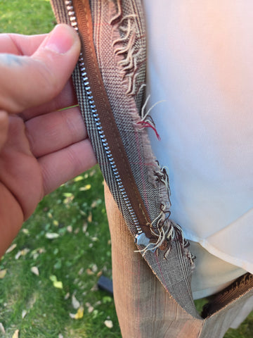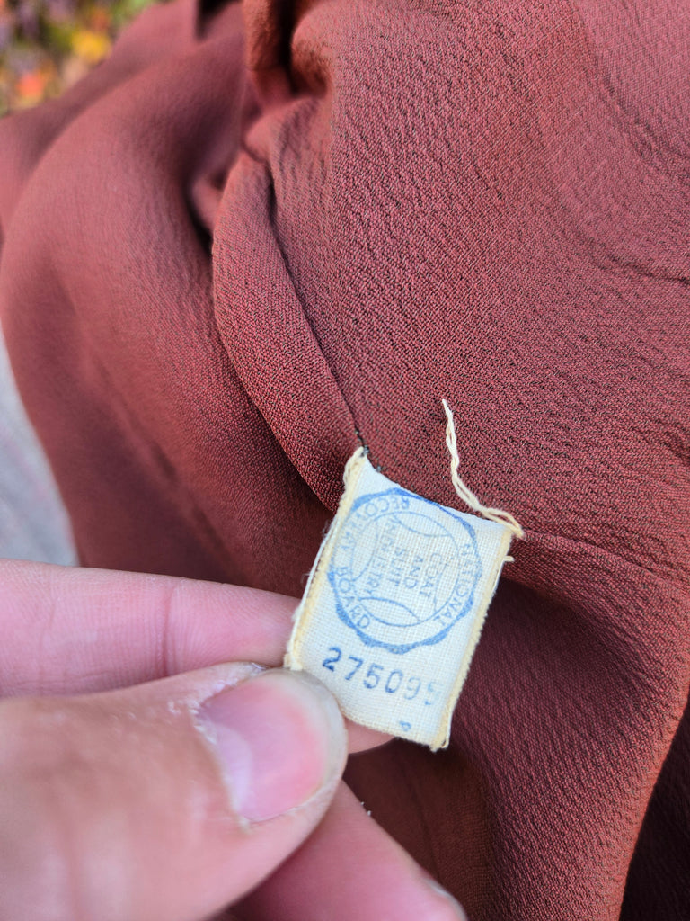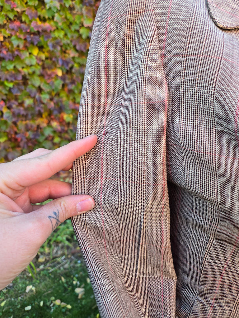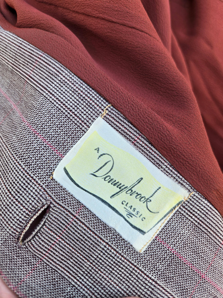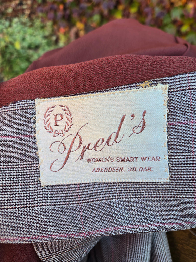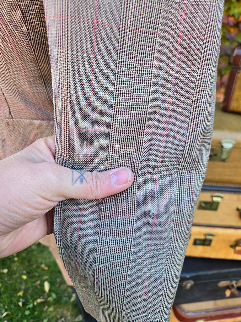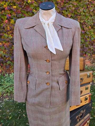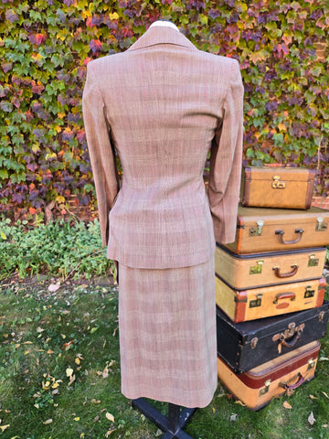 Vintage 1940s brown plaid travel suit with jacket and skirt. Jacket has shoulder pads, faux pockets, and button closure. Skirt is damaged and has a broken metal side zipper.