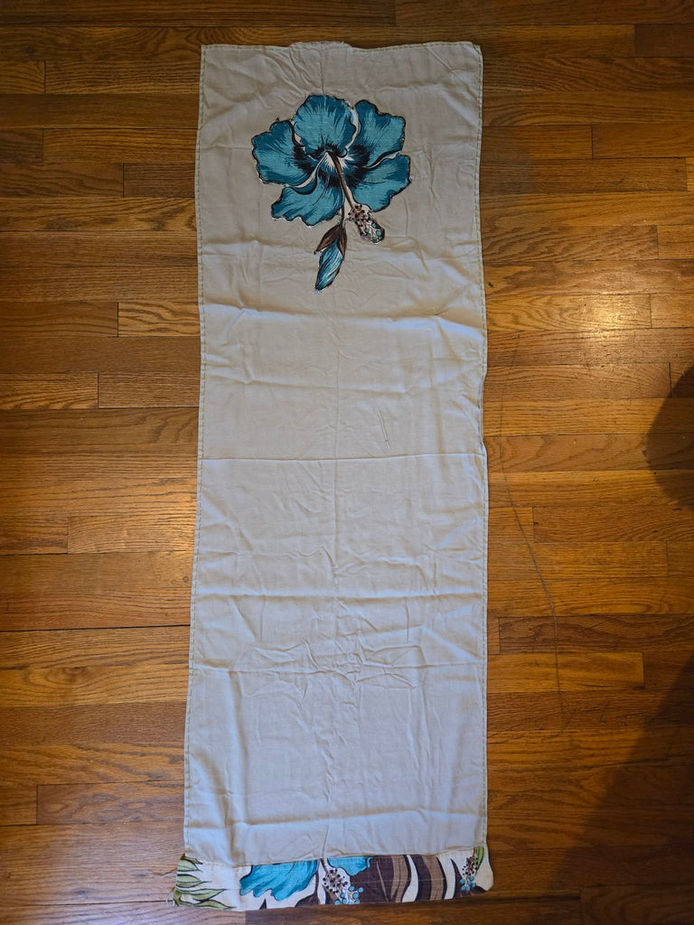 Vintage Barkcloth Table Runner Grey with Teal Hibiscus Floral Applique