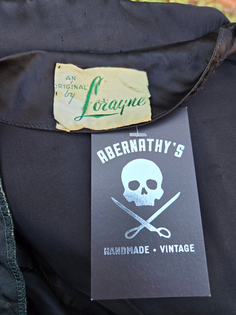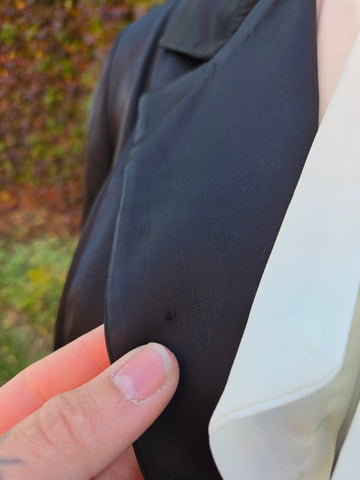 Vintage 1940s black satin Marlene Dietrich inspired blazer jacket. This jacket features pointed cuffs, pockets, and button closures.
