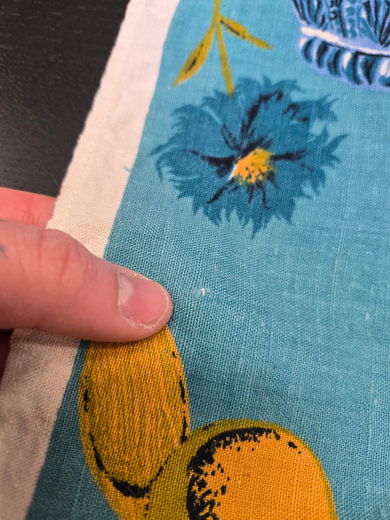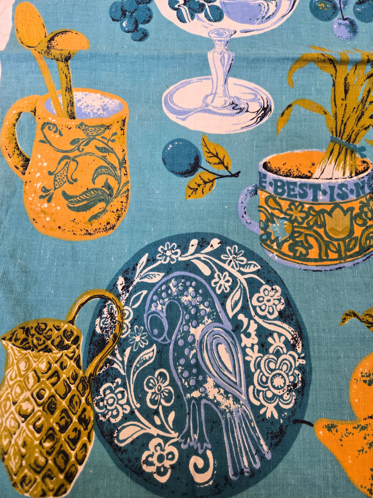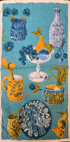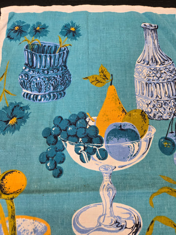 Vintage Blue Fruit and Dish Novelty Print Tea Towel