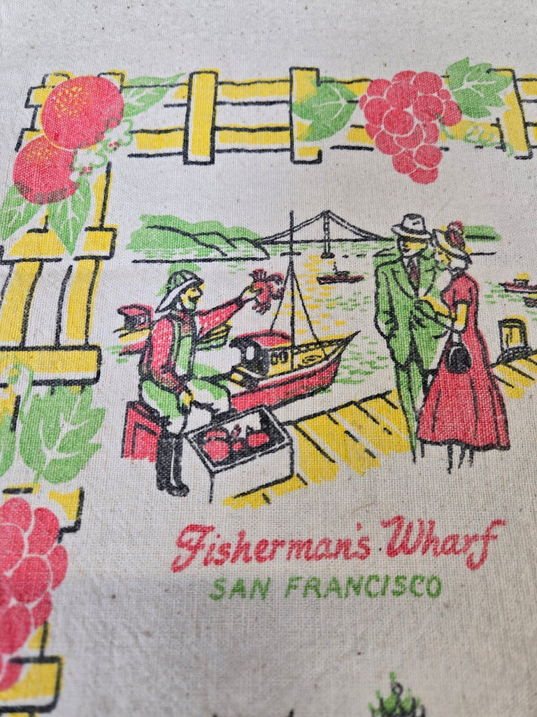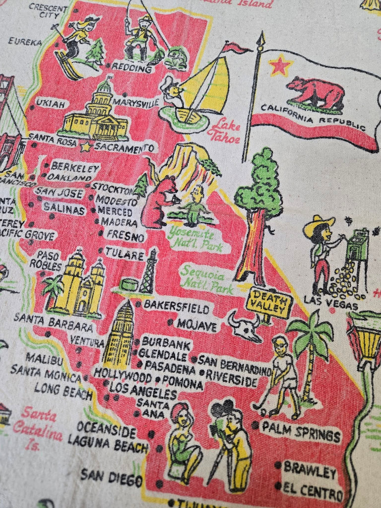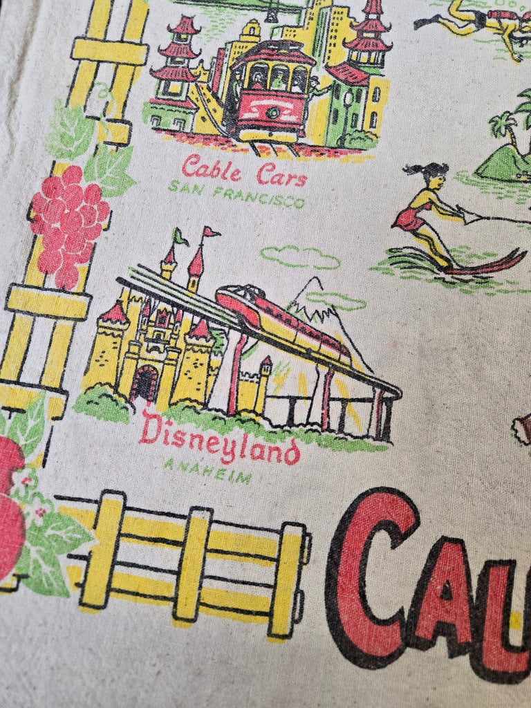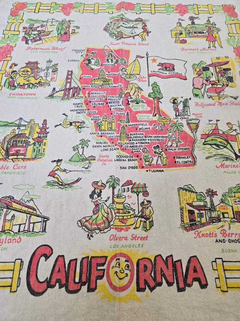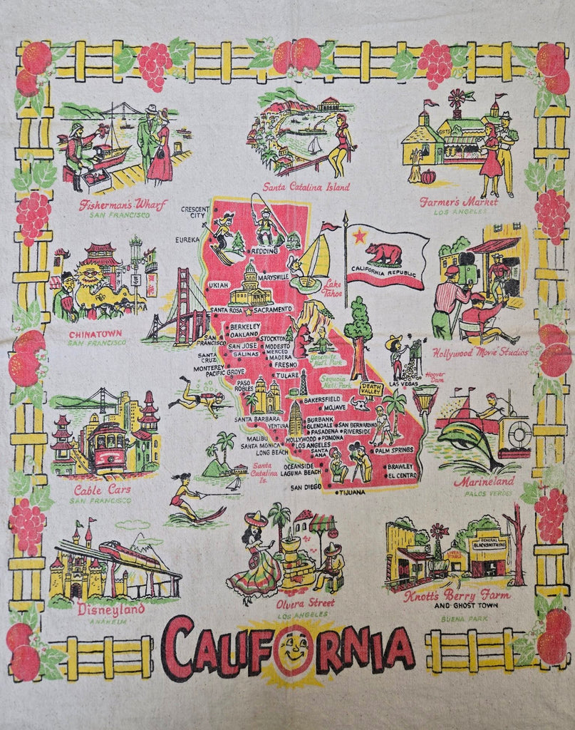 Bring a splash of California nostalgia to your kitchen with this charming vintage souvenir tea towel! Featuring iconic Golden State landmarks—the magic of Disneyland, the bustling energy of Fisherman's Wharf, and the glamorous Chinese Theatre—this piece captures the spirit of classic West Coast adventures. Perfect for drying dishes, displaying as décor, or gifting to fellow California dreamers.