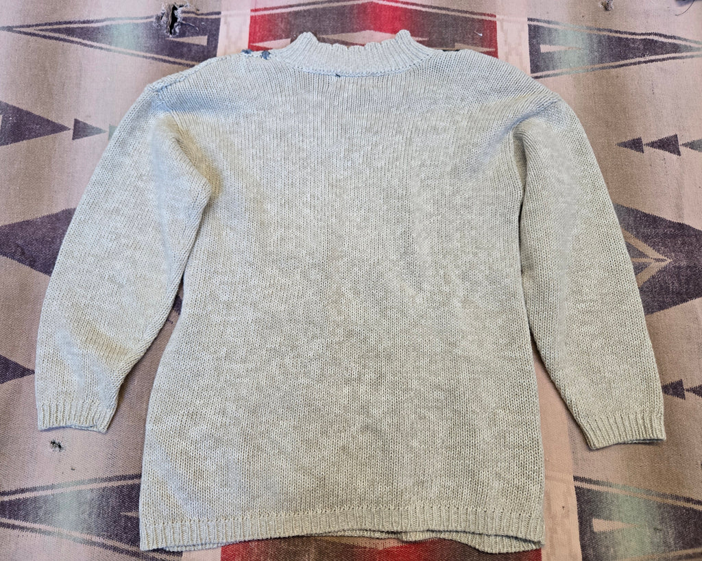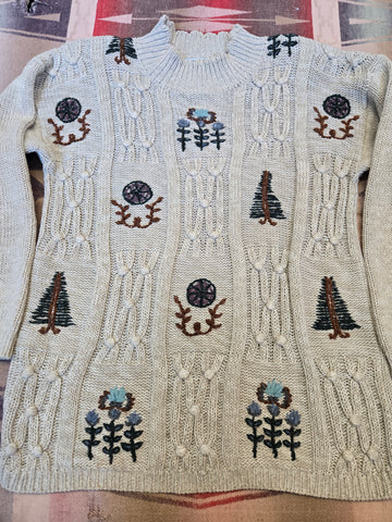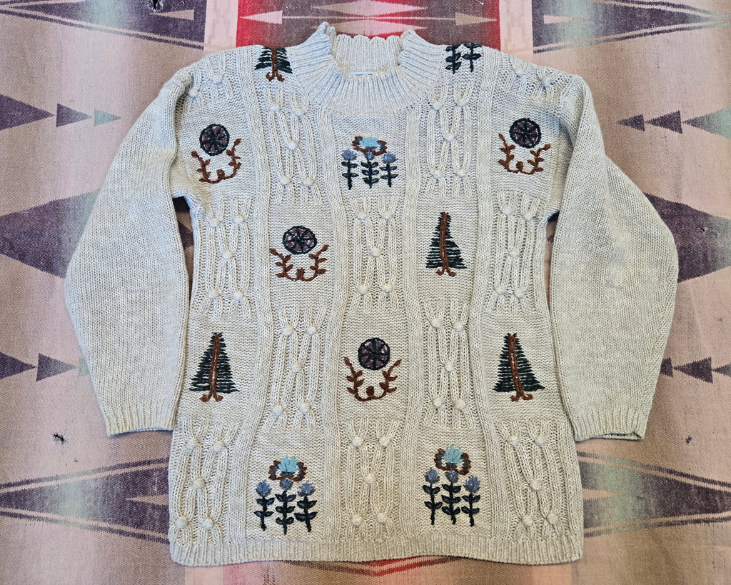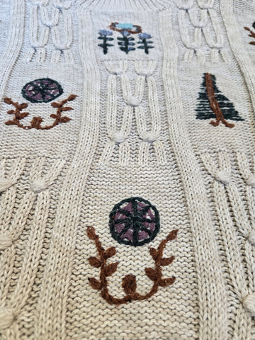 Vintage 1990s off white knit sweater with pine trees and flowers embroidered design and shoulder pads