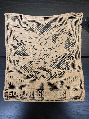 God Bless America crocheted lace featuring an eagle and two American flag crests. Perfect for framing or hanging on the wall.