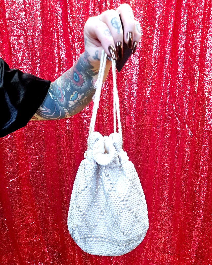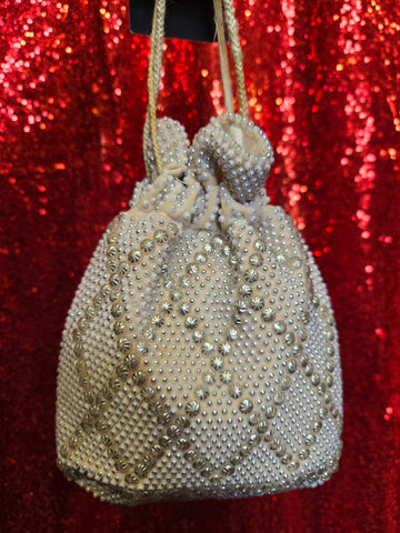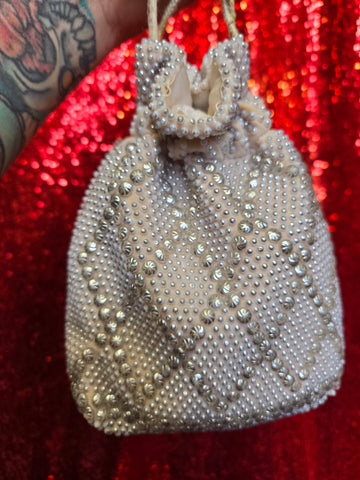 Vintage cream color plastic beaded bag with drawstring handle. Each plastic bead is painted to look like metal on top. Drawstring is shoelace like and has damage.