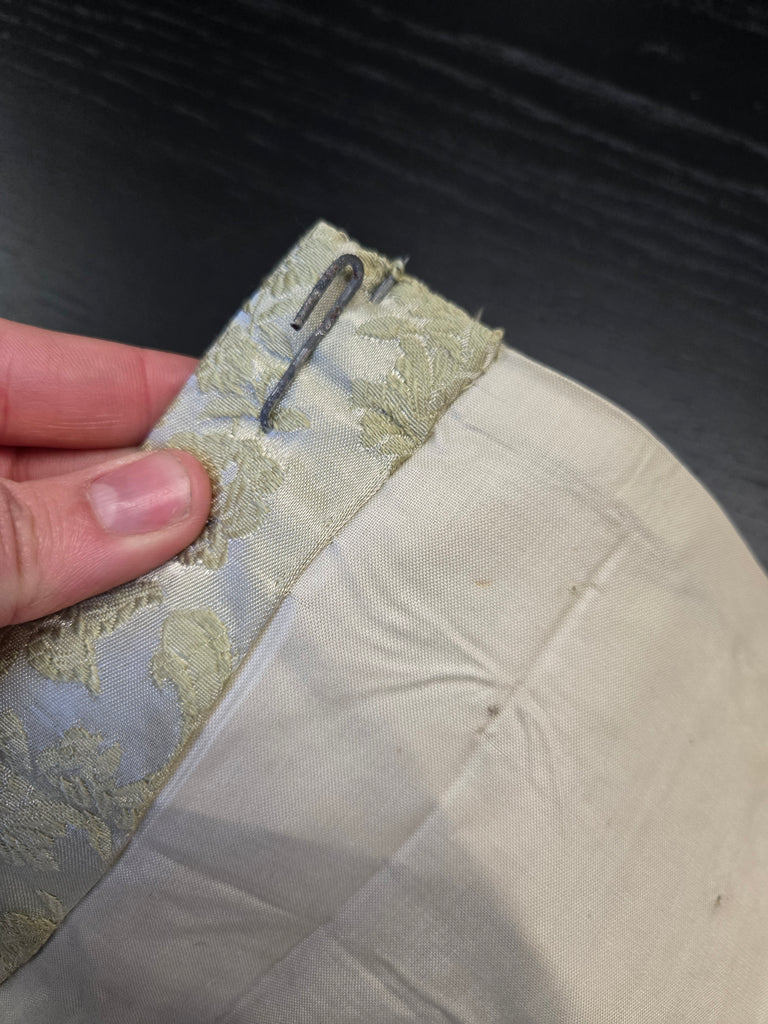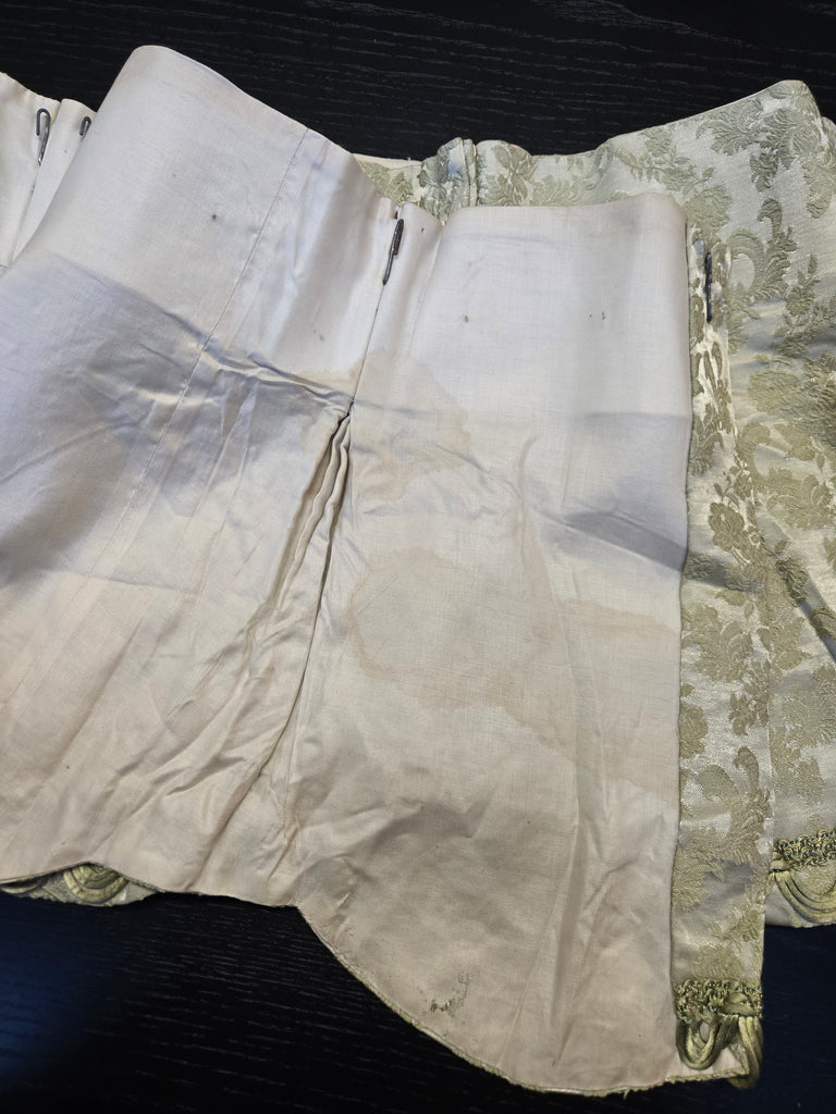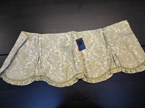 Scalloped brocade window valence in pastel mint green with scalloped satin trim along the bottom. This curtain features pleating along the top and hooks to connect it to a curtain rod.