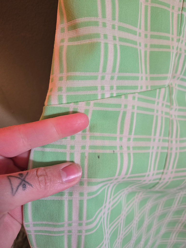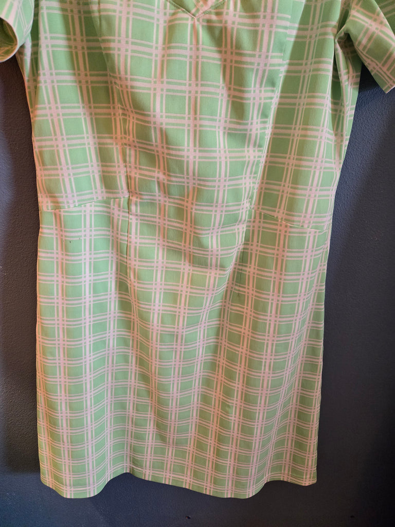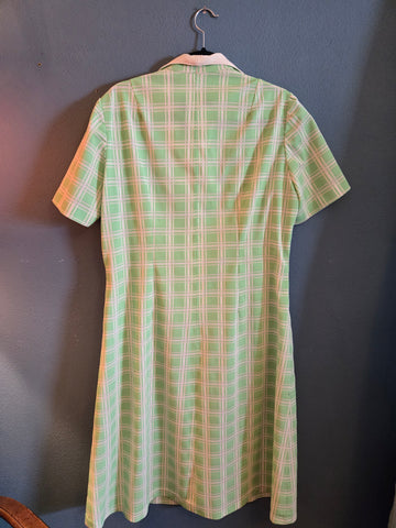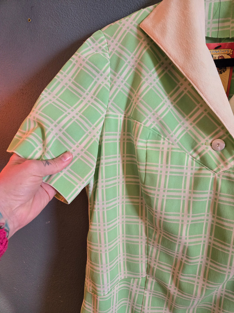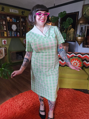 Vintage 1960s green and white plaid polyester shift dress with white collar and rhinestone button closure