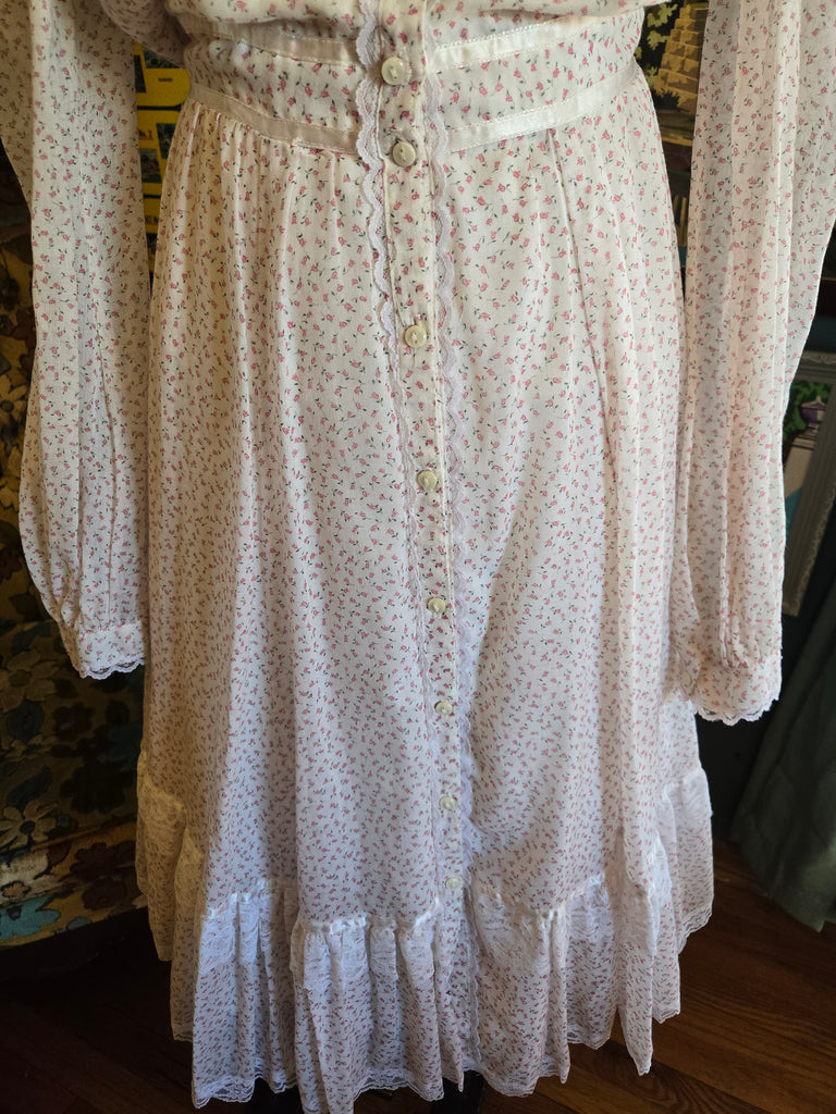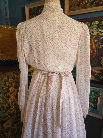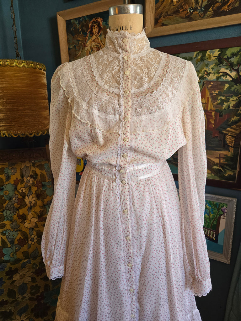 Vintage 1970s white with pink tulip print Gunne Sax by Jessica dress with white lace high neck, tiered lace ruffle on skirt, white satin ribbon waist with tie belt, and white button closure.