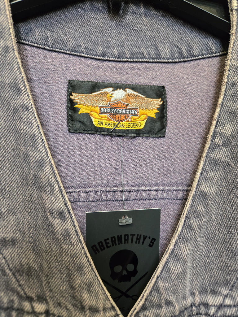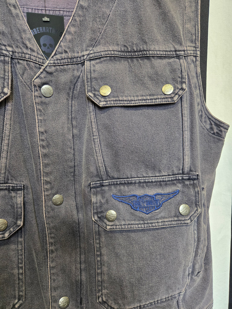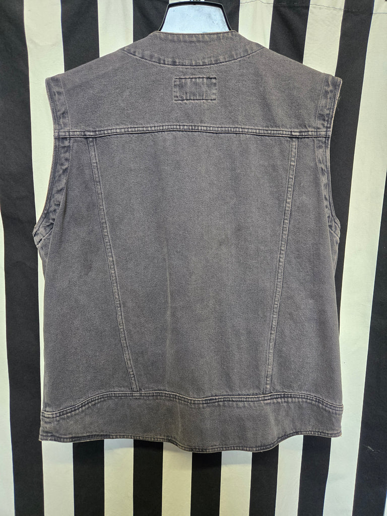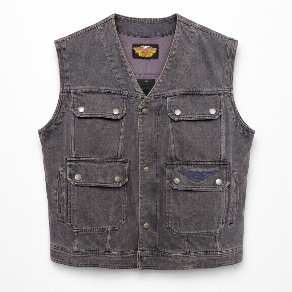 Vintage 90s Gray Denim Harley Davidson Vest. This vest features six exterior pockets and a zipper closure with snaps over top.