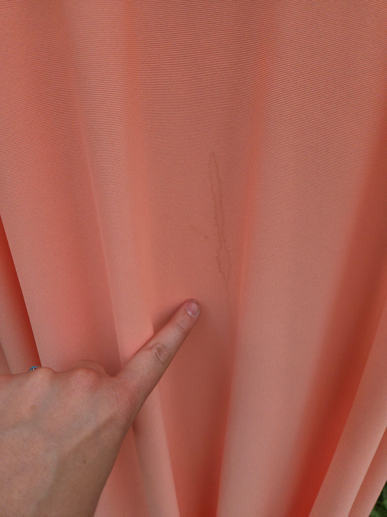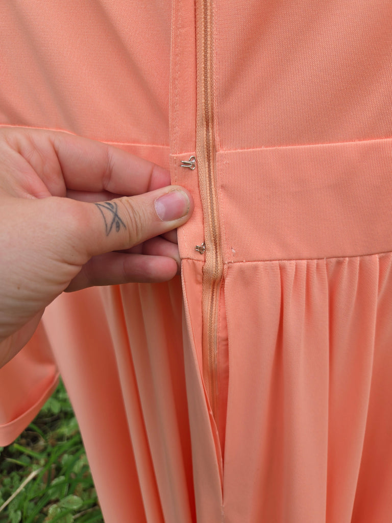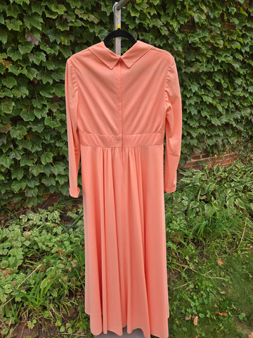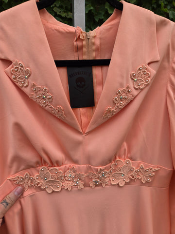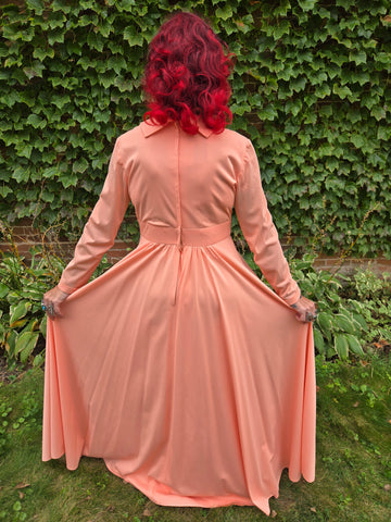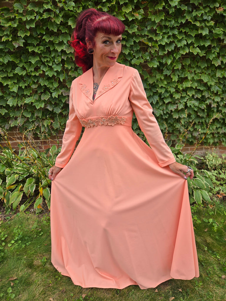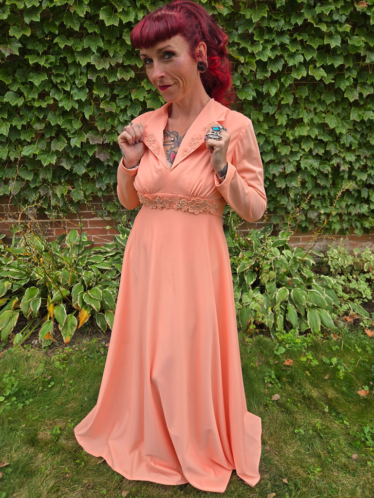 Vintage 70s Pastel orange formal maxi dress with embellished collar with floral lace, rhinestones, and pearls. This dress features a zipper closure in back with hook and eye closures at neck and waistband.